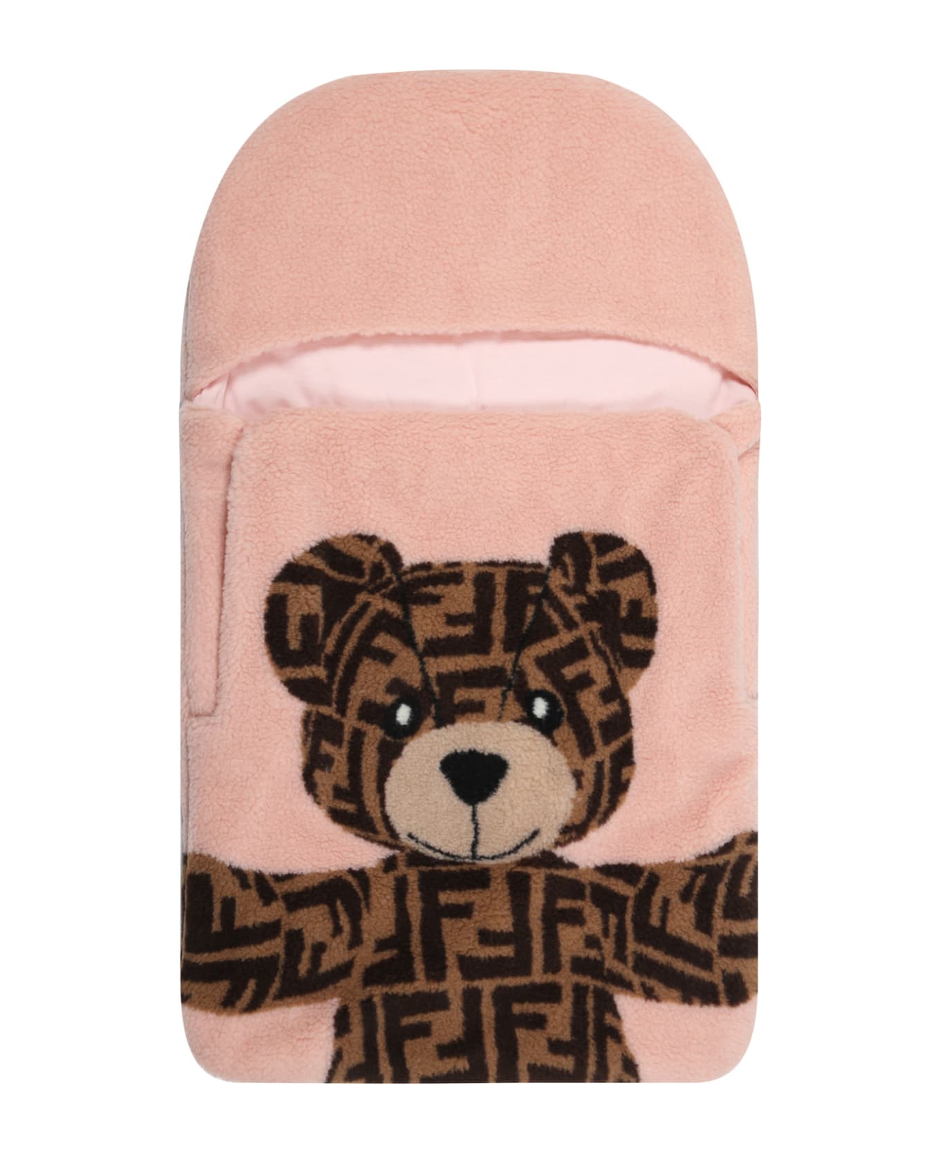 Pink sleeping bag, made from shearling, with press-studs closure on the sides. It is embellished with iconic loged bear, on the front and back.