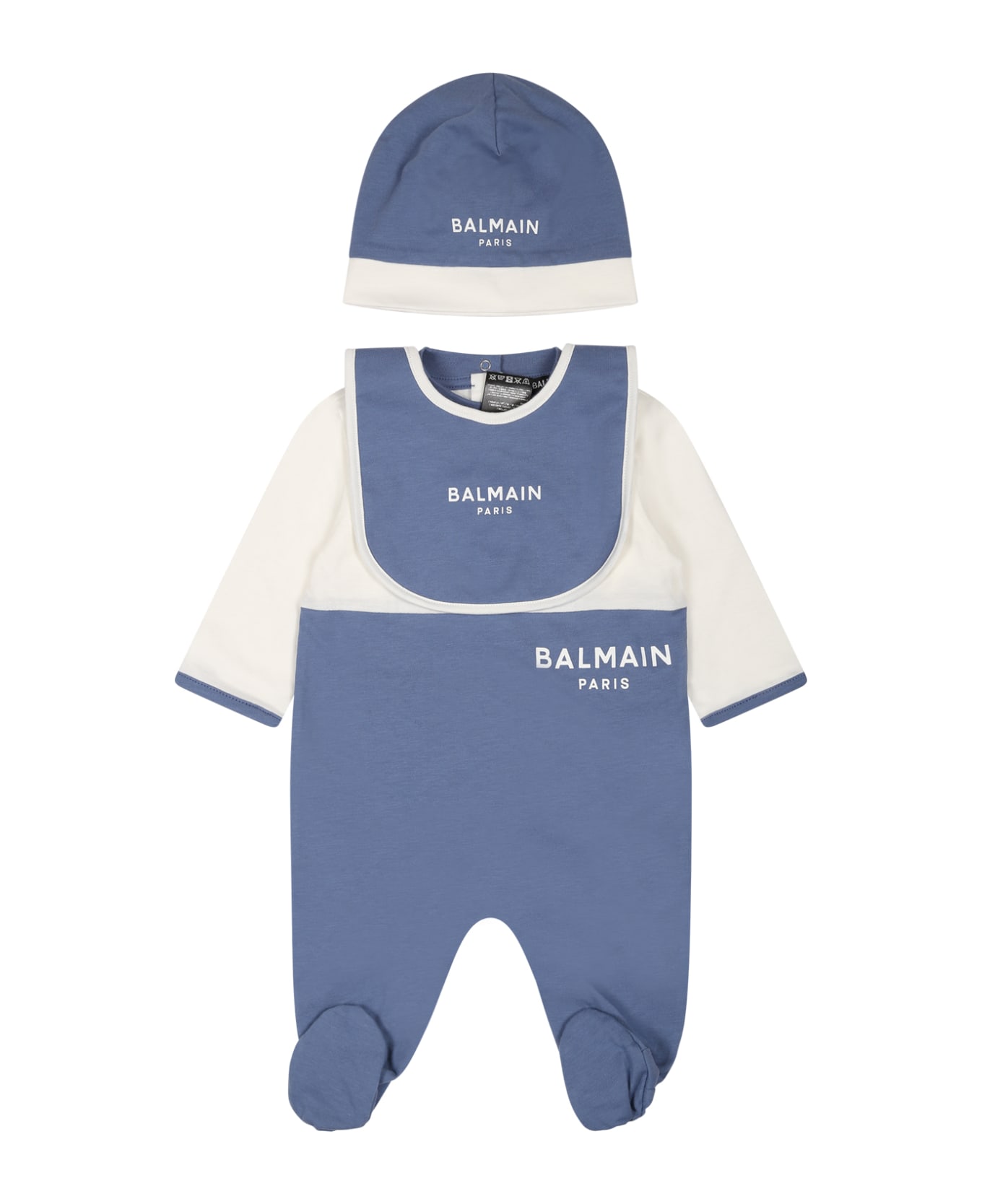 Blue set in cotton, composed of babygrow, hat and bib; onesie with long sleeves, ribbed crew neck, feet, popper fastening at back and between legs; bib with snap button closure on the back and white piping; cap with white edge. They are embellished with white logo on the front.
