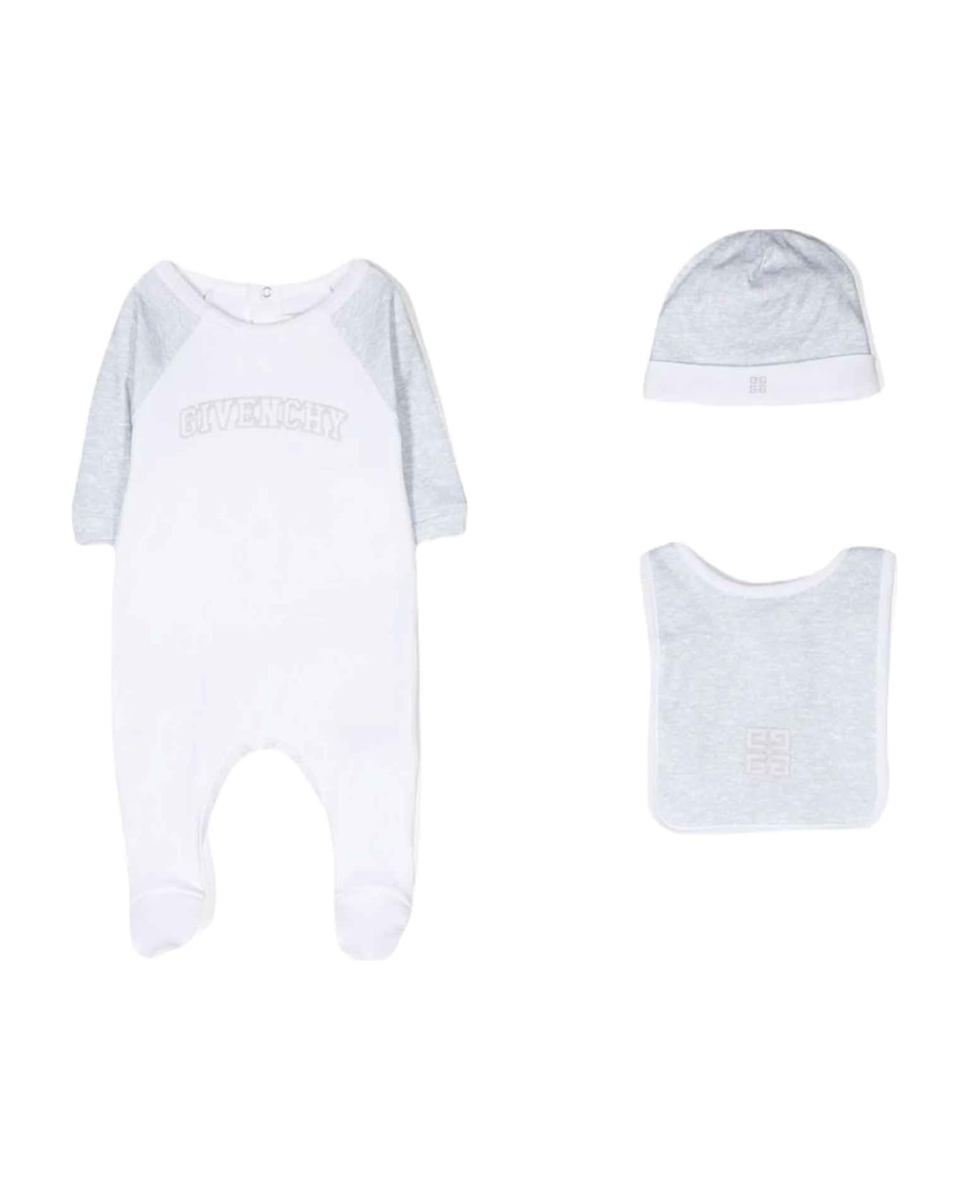 Gray set baby unisex. Logo print to chest, round neckline, long sleeves, back snap button closure and sock design. 100% Cotton