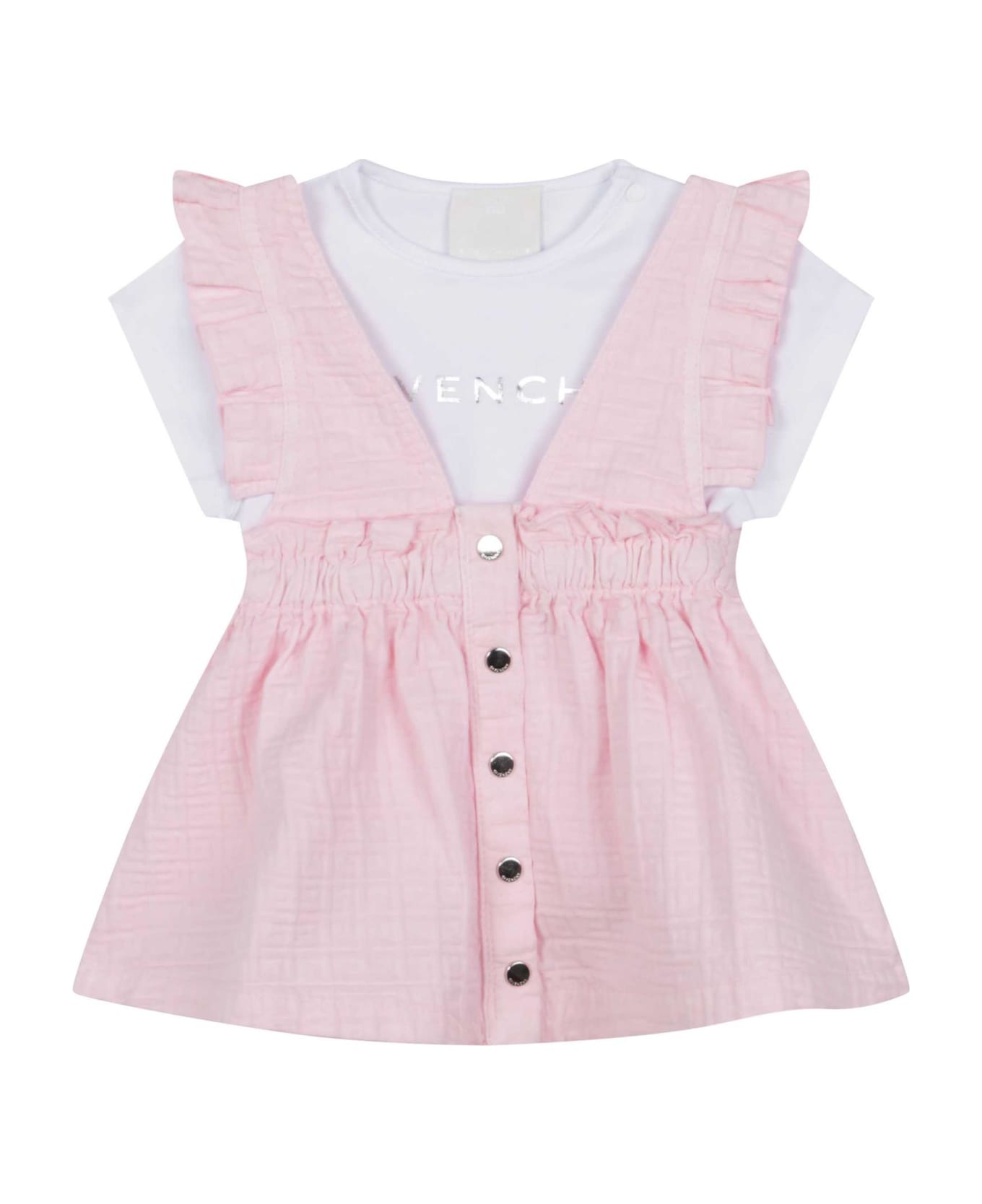 Light pink, white, cotton, logo print to chest, metallic effect, round neckline, short sleeves, snap button fastening at shoulder, straight hem, monogram jacquard, ruffle detail, v-neck, wide shoulder straps, sleeveless , elasticated waist, front button closure and flared skirt. Composition 100% Cotton