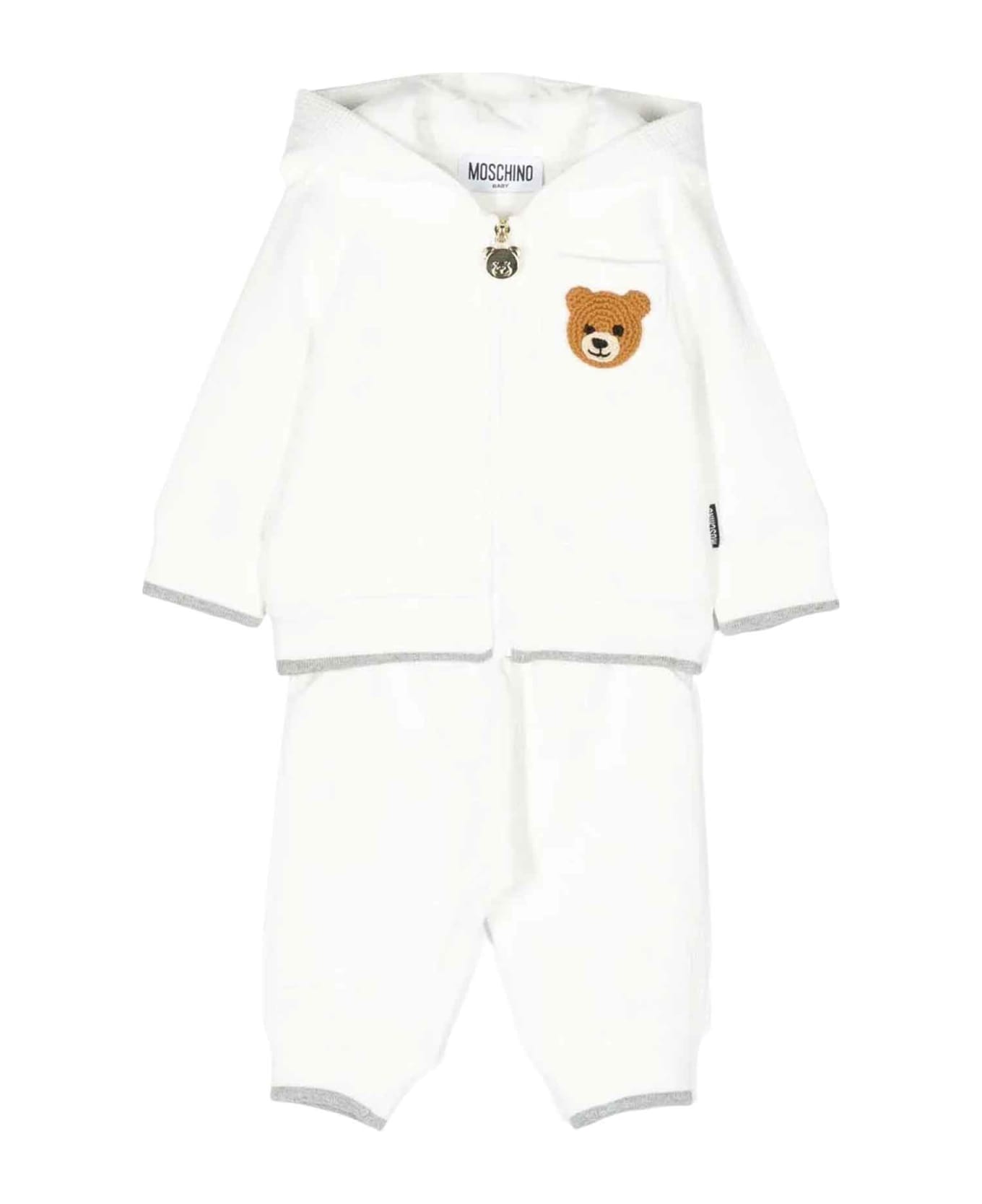 White suit baby unisex. Waffle knit, two separate pieces, signature Teddy Bear motif, mini logo plate, front zip fastening, hood, chest patch pocket, long sleeves, straight hem, elasticated waist, elasticated ankle cuffs and two slant pockets lateral. Cotton 89%, Polyester 11%