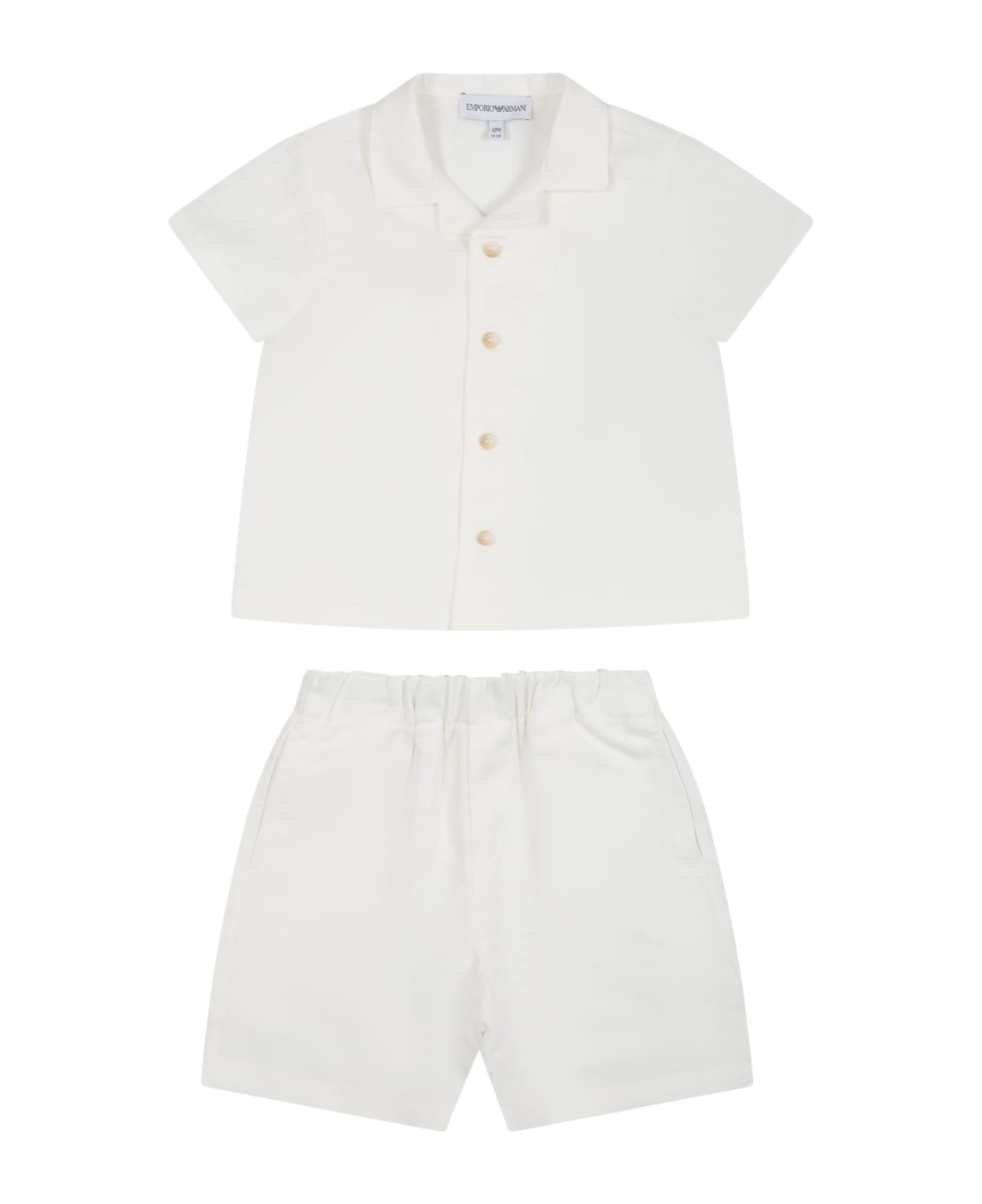 White suit, composed of shirt and shorts; shirt with short sleeves, collar, button closure on the front, embellished with logo and iconic eaglet on the chest; shorts with elastic waistband and side pockets, embellished with logo and iconic eagle on the back.