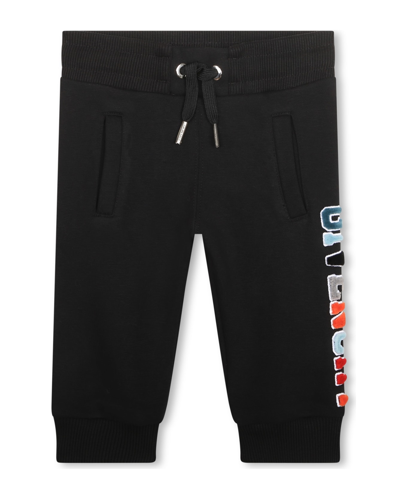 in felpa di colore nero,con coulisse in vita,tasche a scomparsa e logo multicolor cucito lateralmente.