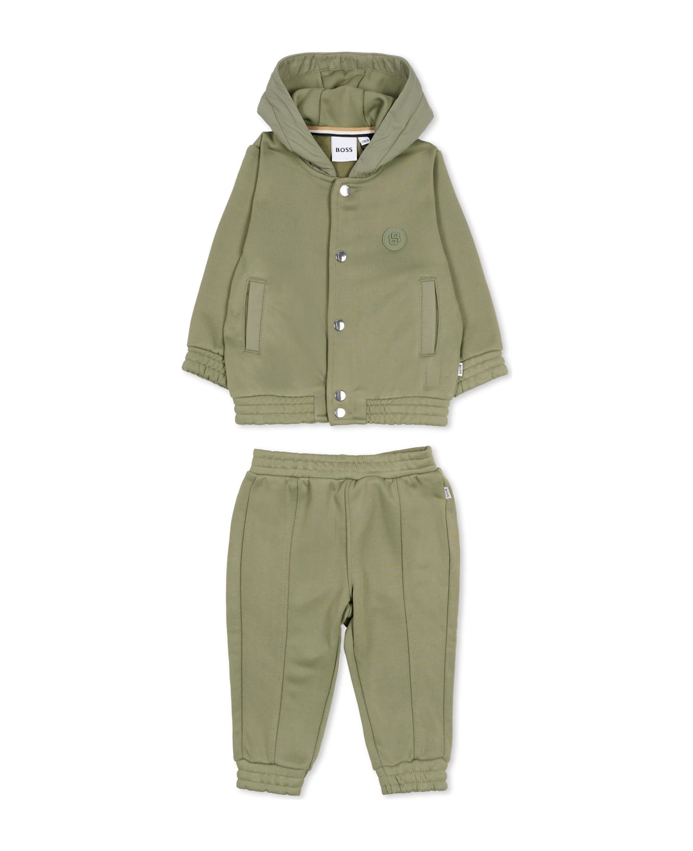 Green suit composed of a sweatshirt and trousers. Long-sleeved brushed sweatshirt with a technical fabric hood, snap front closure, side pockets, and elasticated cuffs and hem; brushed trousers with elasticated waist and ankles. It is embellished with a rubberized logo on the chest.