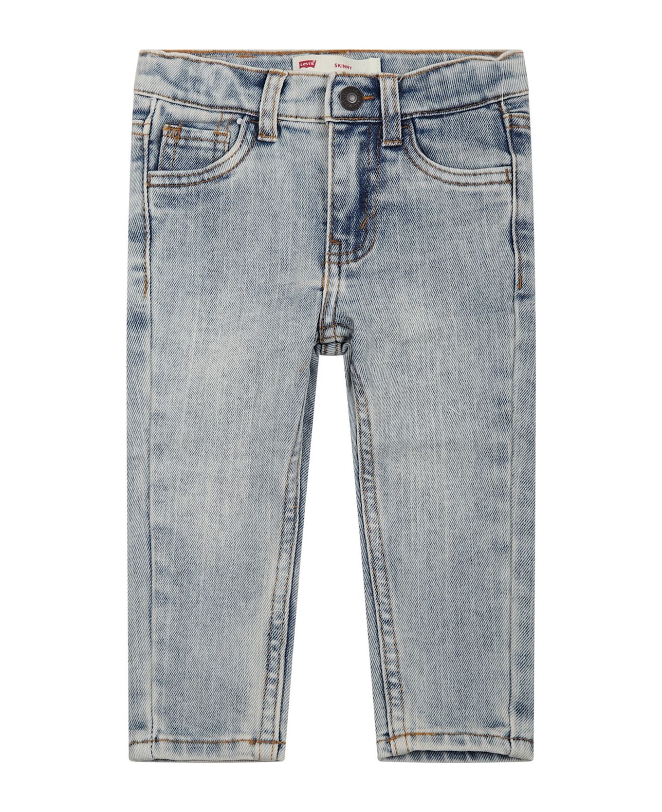 Gray denim jeans, five pockets, with belt loops, zip and button closure on the front, adjustable waist thanks to internal elastic bands with button. They are embellished with logo patch, on the back.