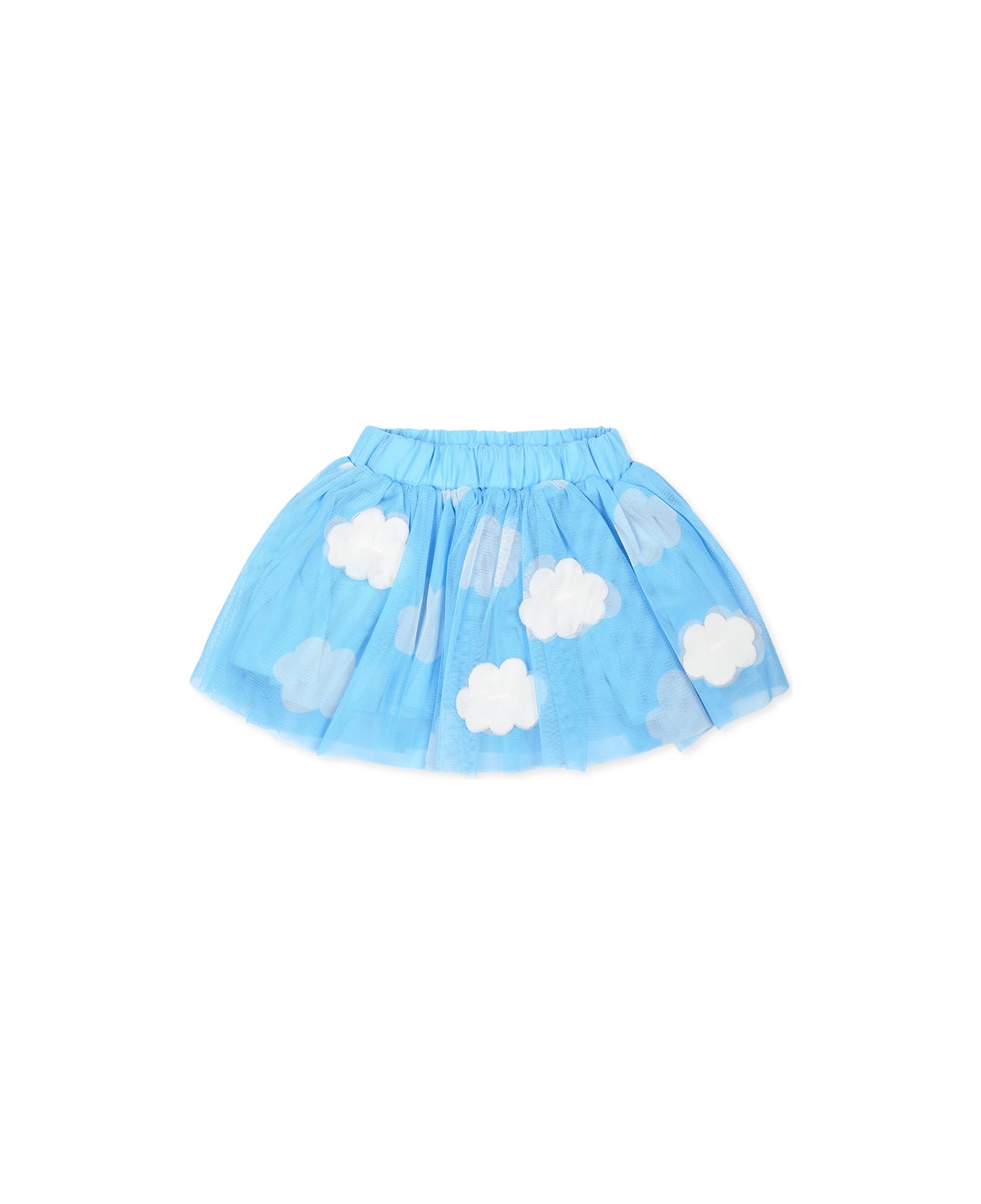 Light blue tulle skirt with elastic waist; made from recycled polyester. It is embellished with all-over clouds and applique clouds on the front and back.
