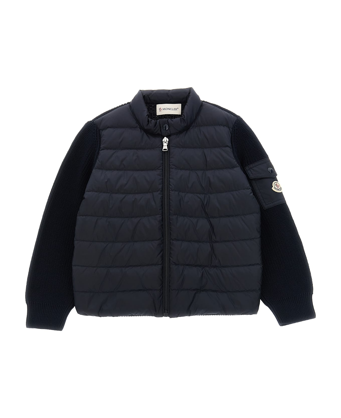 7 fineness cotton cardigan, quilted and slightly quilted nylon front with goose down padding, high neck, front zip closure, long cuffed sleeves and a felt logo patch.