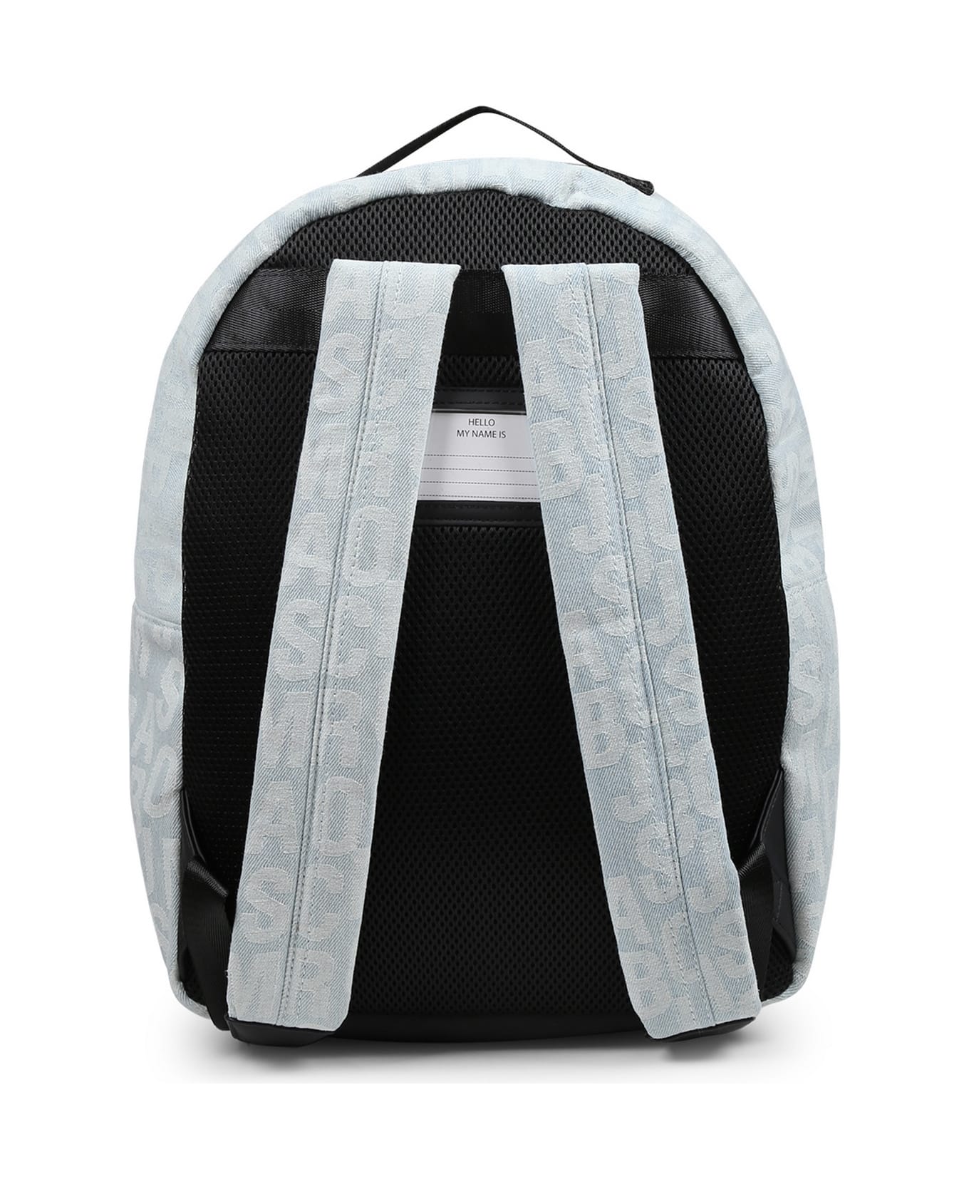Denim backpack with handle, top zip closure, front pocket with magnetic buttons, lightly padded shoulder straps and tag on the back. It is embellished with all-over jacquard logo.