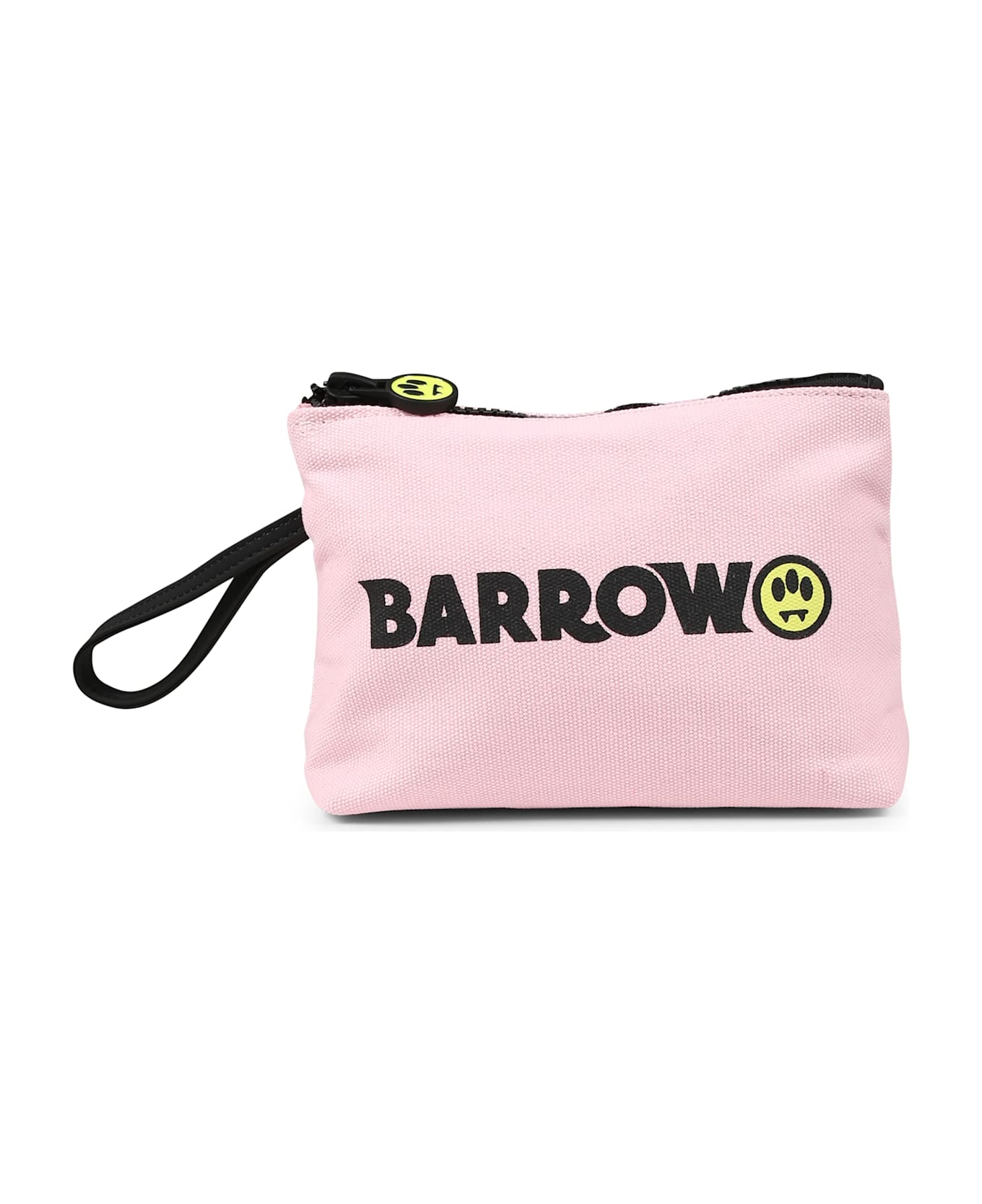 Pink canvas clutch with side handle and top zip. It is embellished with logo and iconic yellow smiley on the front.