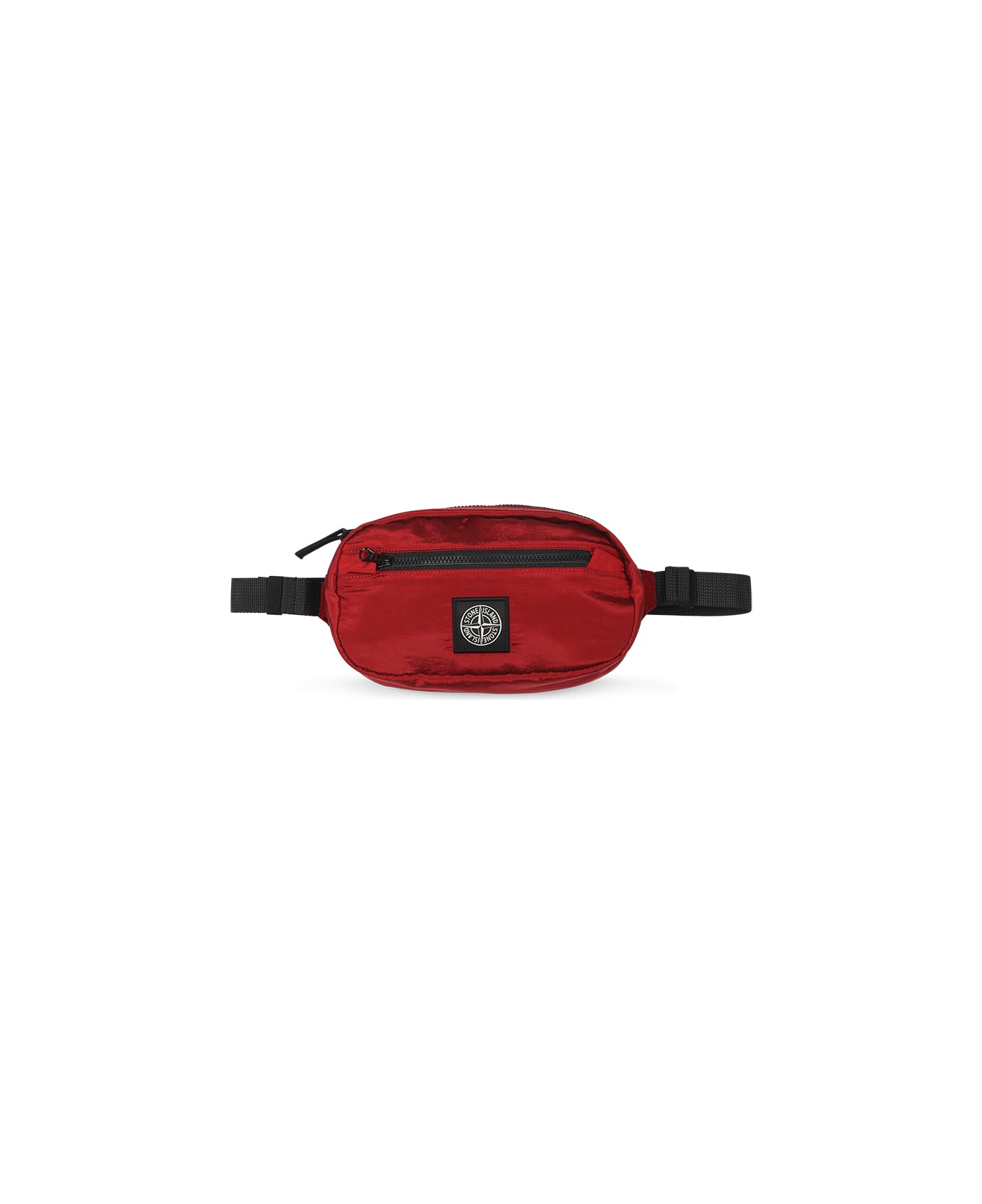 Red belt bag in recycled nylon, with top zip closure, belt with snap buckle and front zip pocket. It is embellished with iconic compass patch on the front.