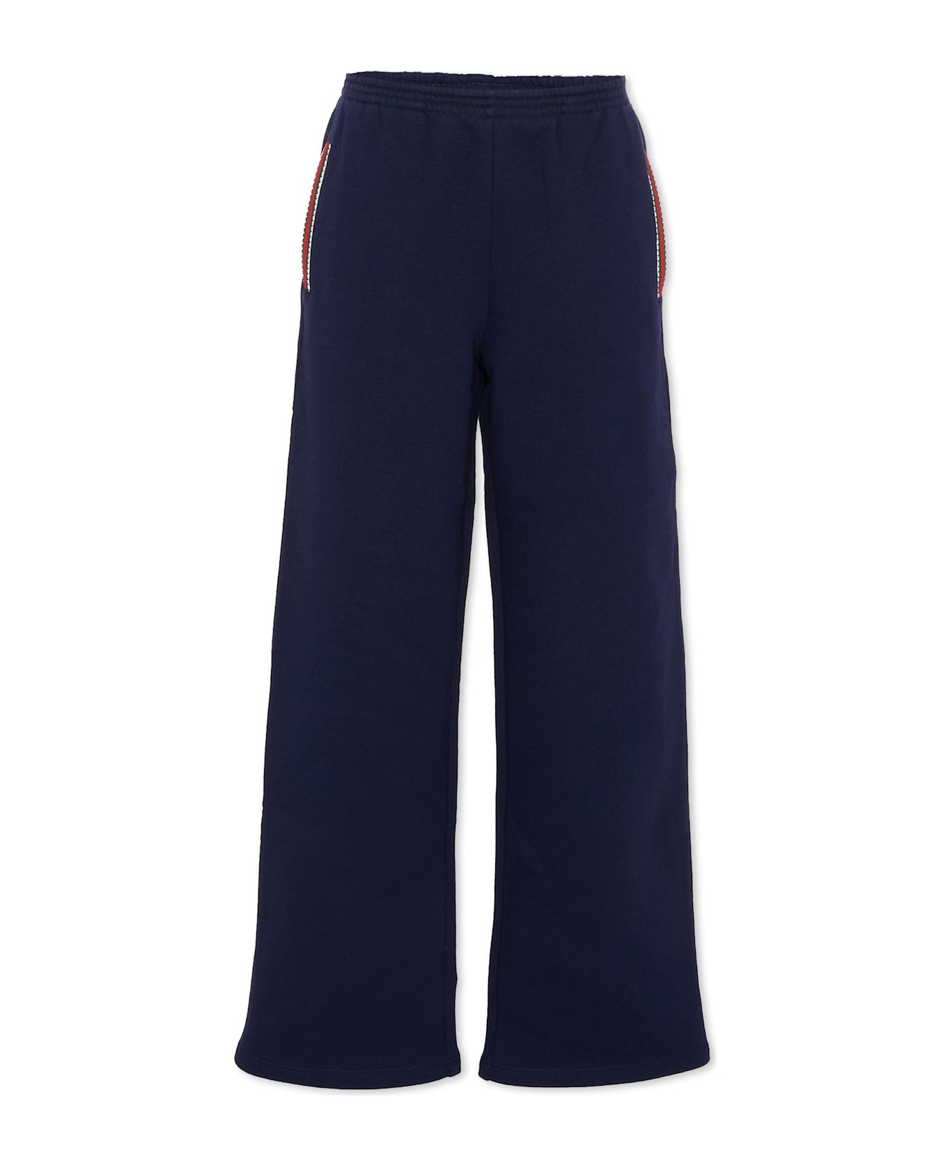 Blue trousers from the luxury brand Gucci Kids, crafted from lightly fleeced cotton. They feature an elastic waistband and side pockets. They are embellished with red and green knitted Web detailing, for a sporty, retro-inspired touch.