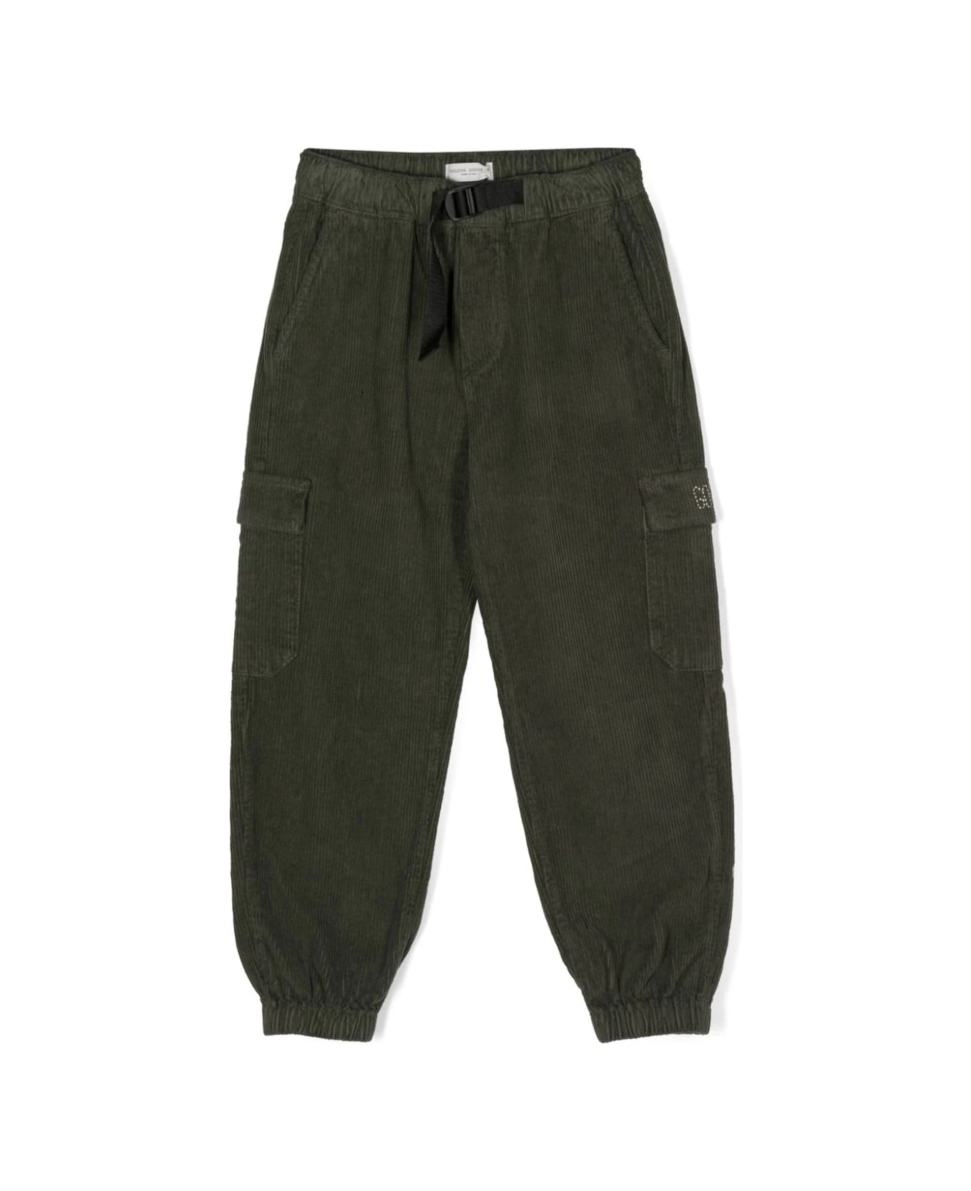 Olive green, corduroy, tapered leg, elasticated waist, belted model, two side welt pockets, two side cargo pockets, back welt pocket and elasticated ankle hems. Composition