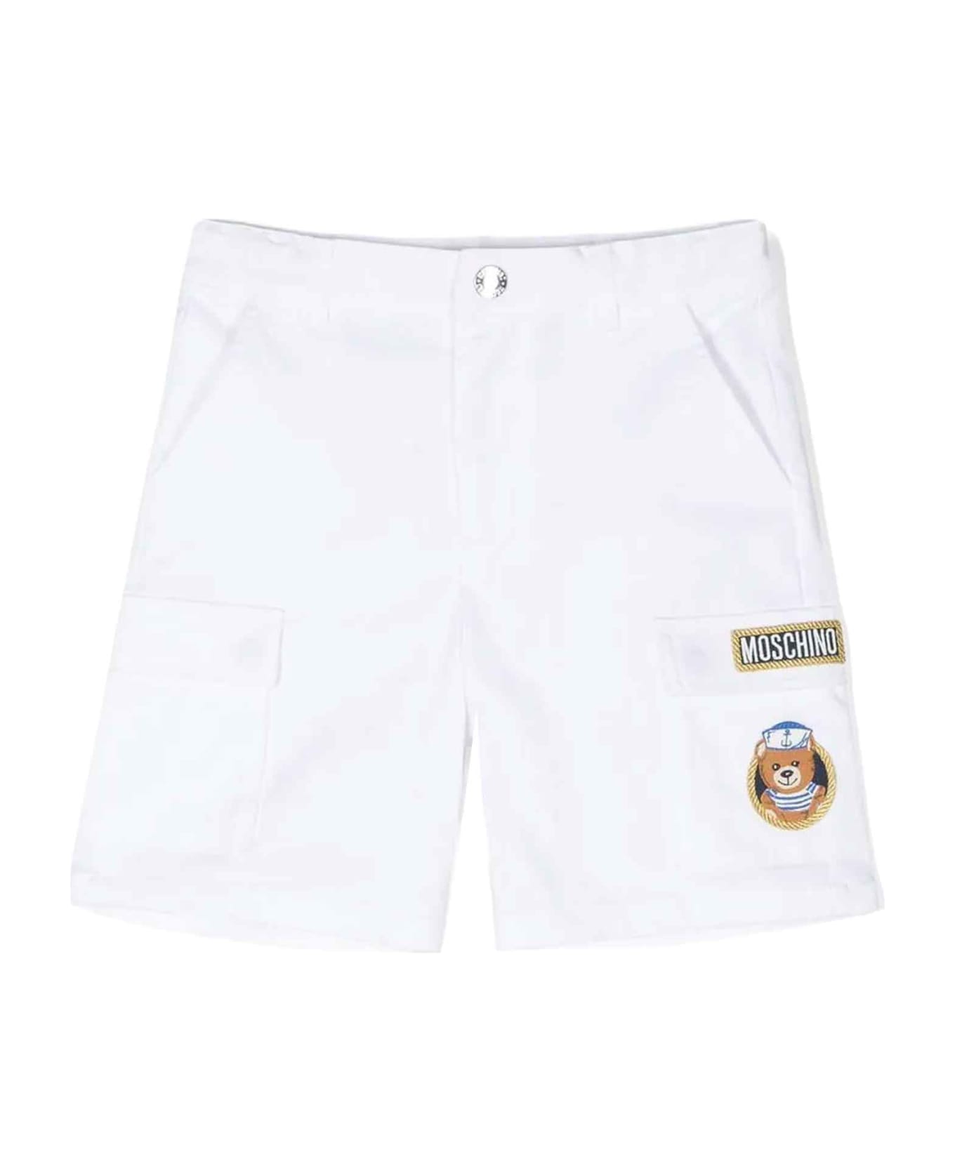 White shorts boy. front logo applications, belt loops, hidden front closure, two side diagonal pockets and side cargo pocket. Polyester 100%, Cotton 97%, Elastane 3%