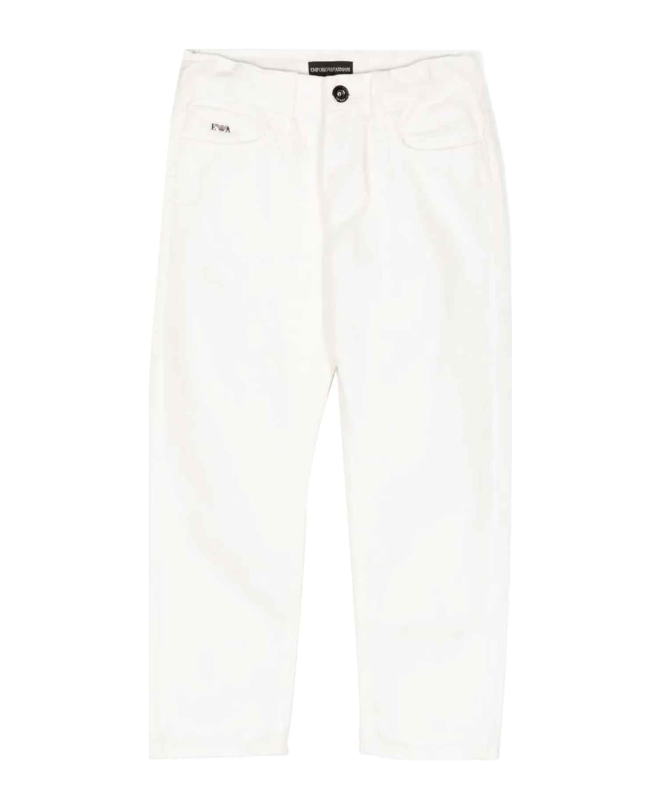 White trousers boy. Embossed logo detail, belt loops, shoulder button placket, zip fly, classic five pocket design and straight fit. 100% Cotton