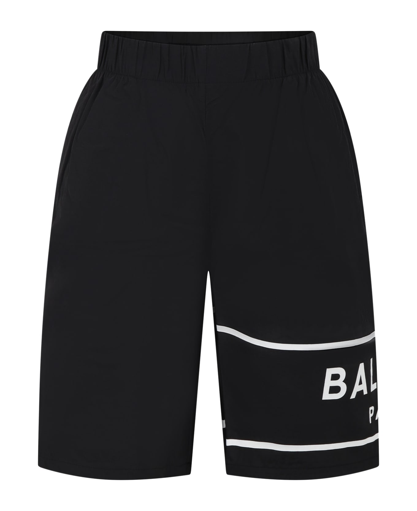 Black swim boxer with elastic waistband and side pockets. It is embellished with white logo on the leg.