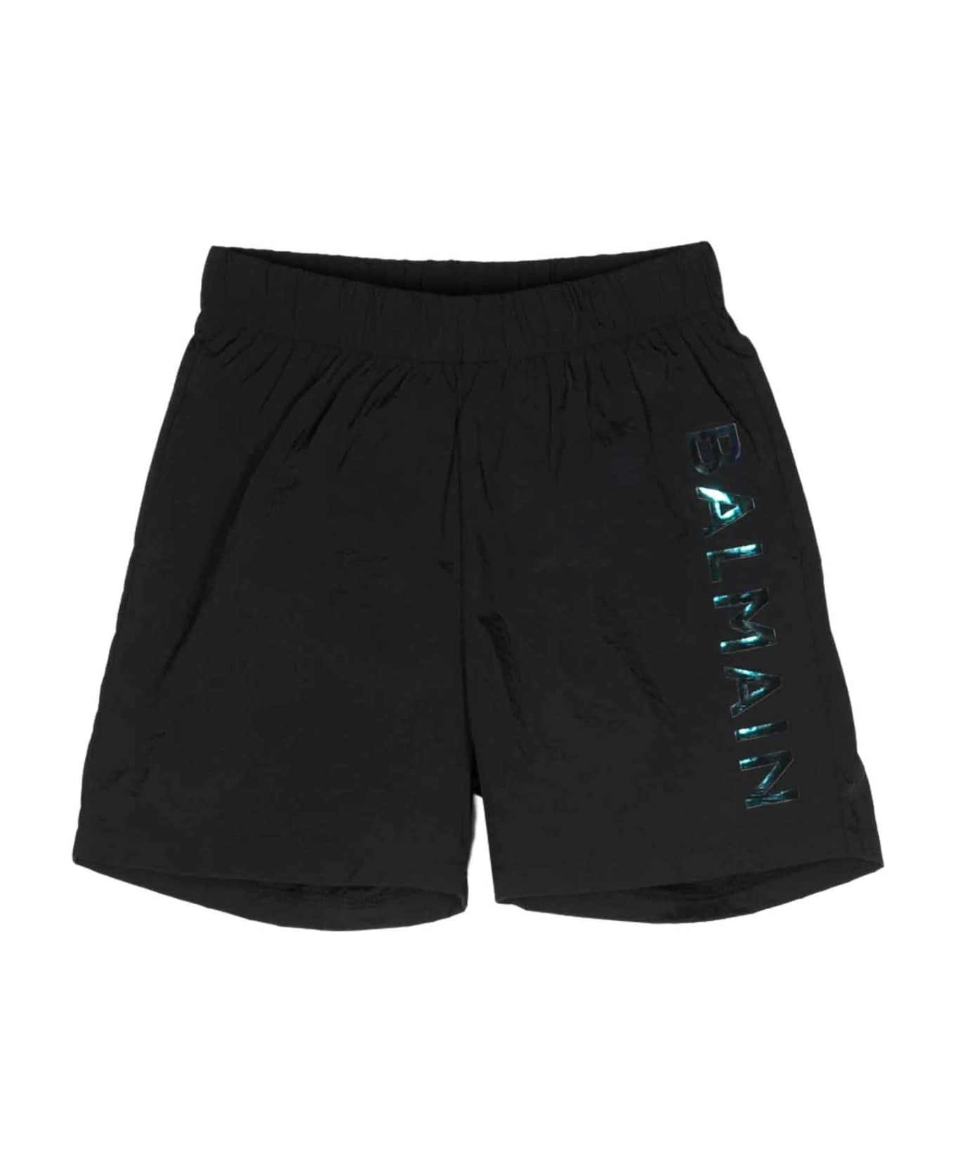 Black swimsuit boy. Logo print on the leg, elasticated waist, above the knee length and straight hem. 100% polyester