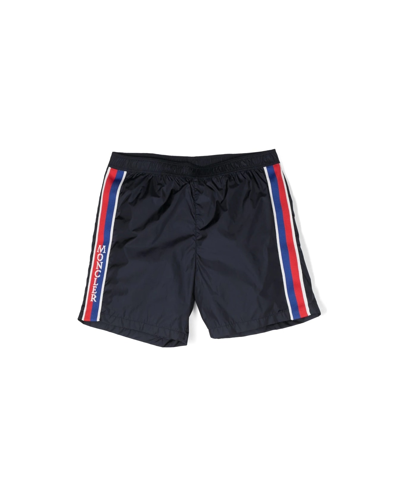 Moncler Enfant swim shorts made of red recycled nylon technique beachwear and embellished on the legs with a tricolour logoed band. Model with elasticated waist and one patch pocket.