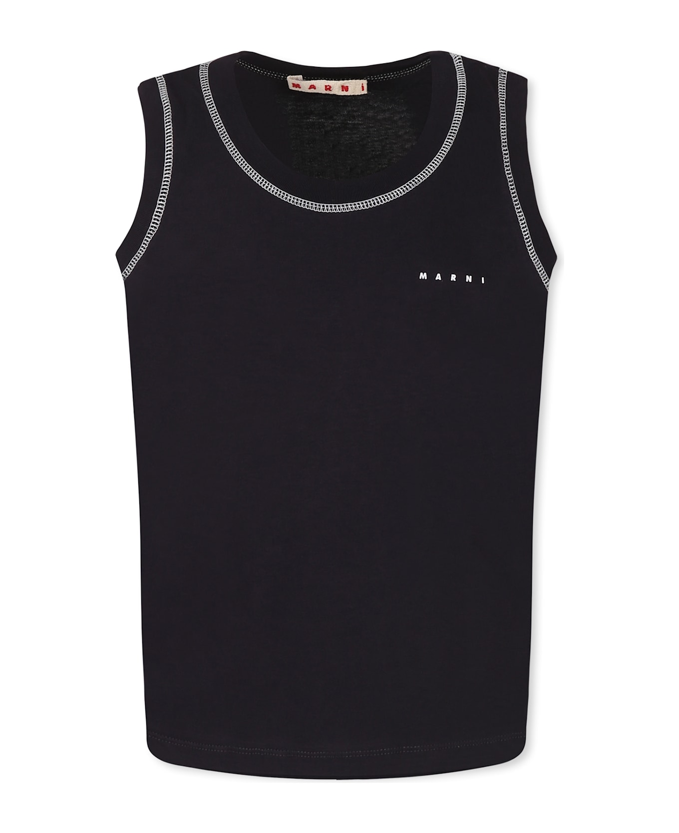 Blue cotton tank top with ribbed crew neck and contrasting stitching. It is embellished with white logo on the chest.