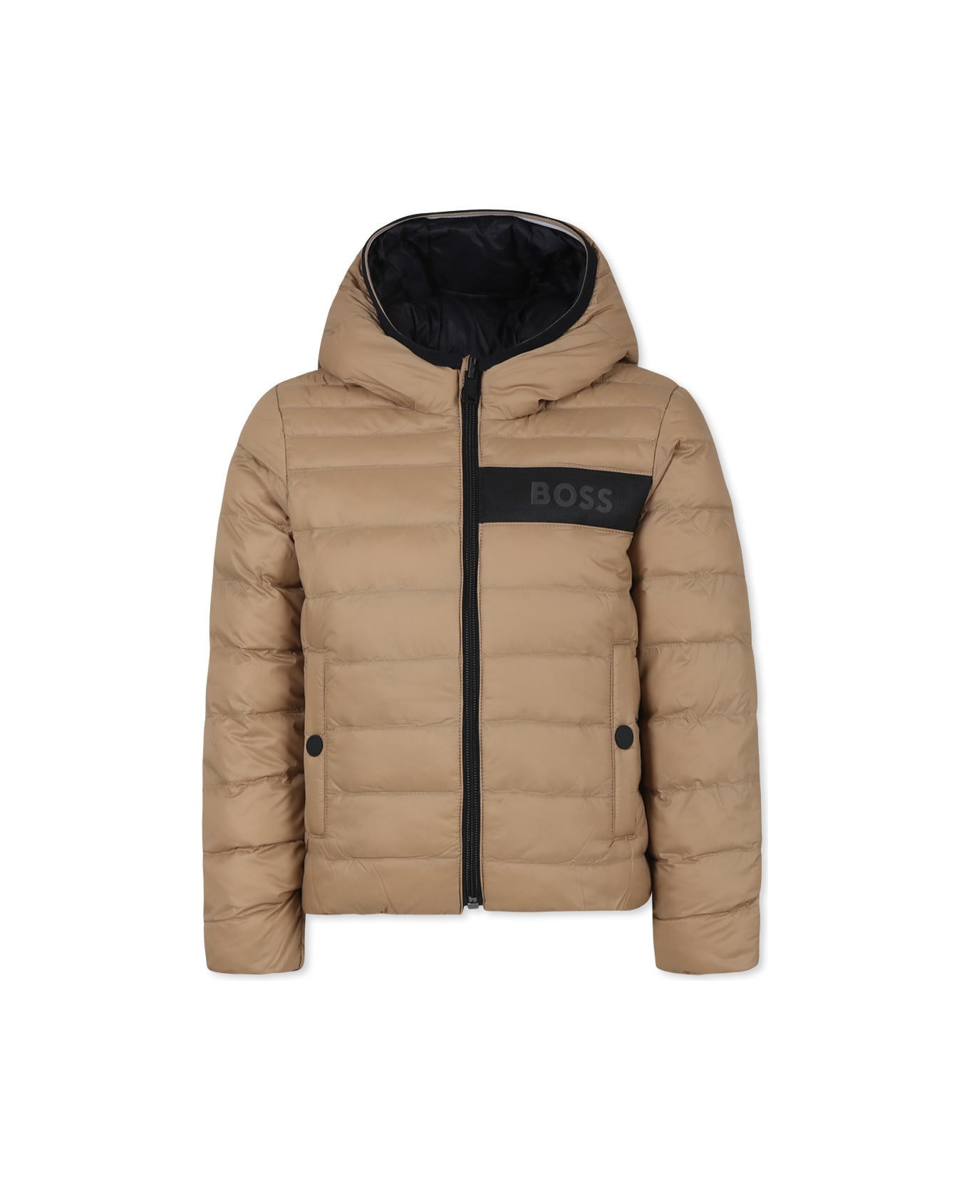 Beige reversible lightly padded and quilted down jacket, waterproof, long sleeves, with hood, front zip fastening, side pockets with button. It is embellished with logo on the chest, on one side; with a contrasting band on the chest and logo, on the other side.