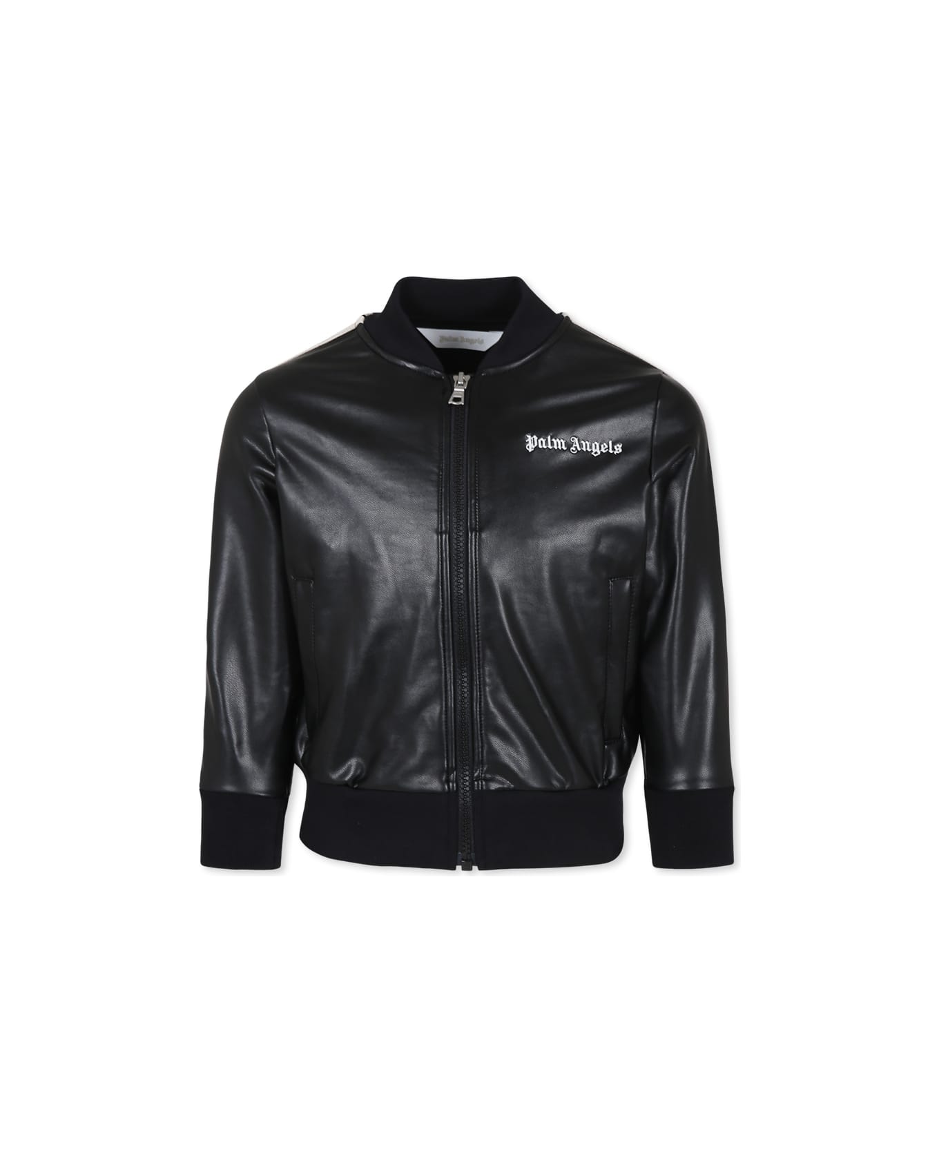Black faux leather jacket with long sleeves, elastic ribbed cotton collar and cuffs, front zipper closure and side pockets. It is embellished with beige side bands and white embroidered logo on the chest.