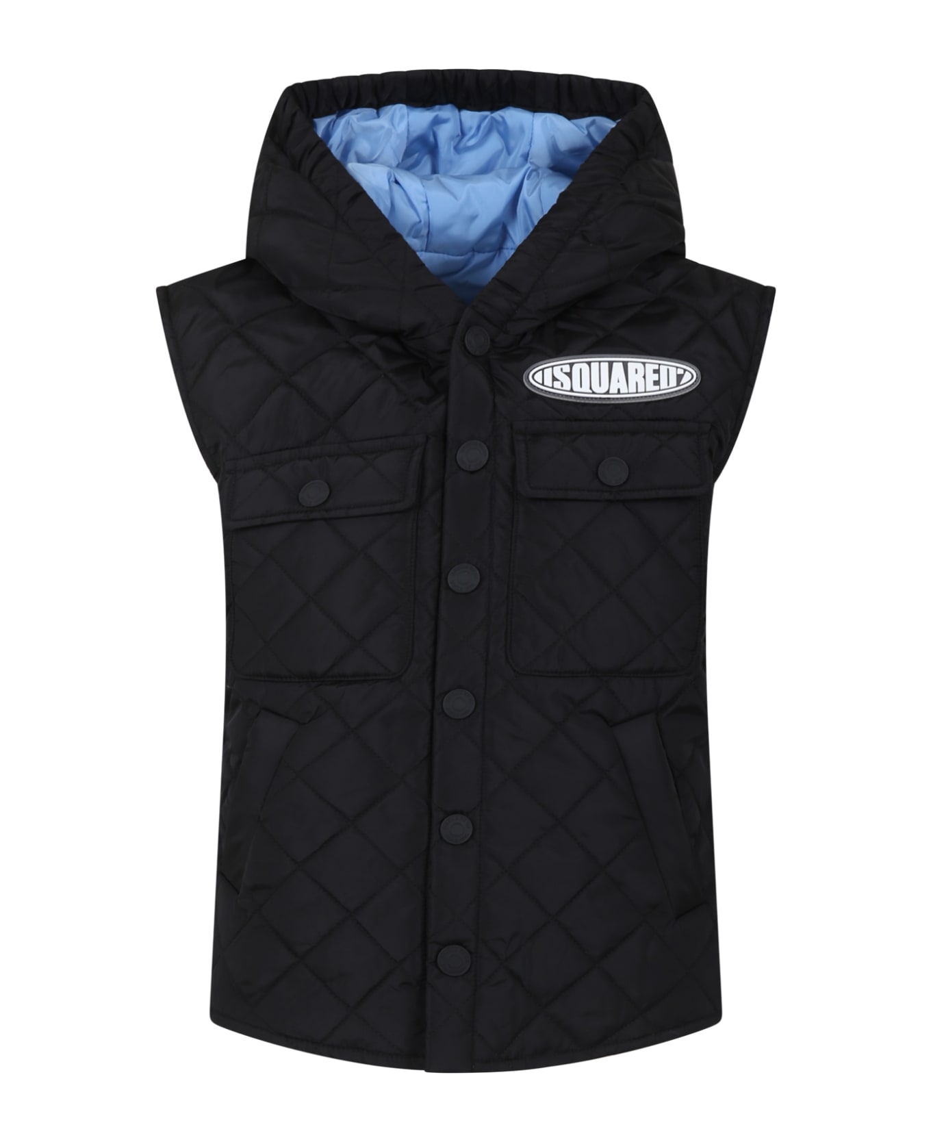 Quilted and lightly padded black vest, with hood, front closure with snap buttons, side pockets, front pockets with snap button. It is embellished with logo patch on the chest.