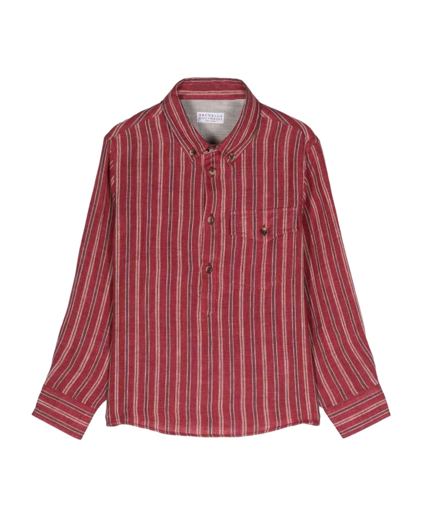 Red shirt boy. Vertical stripe pattern, classic collar, chest pocket and long sleeves. Linen 100%, Cotton 100%
