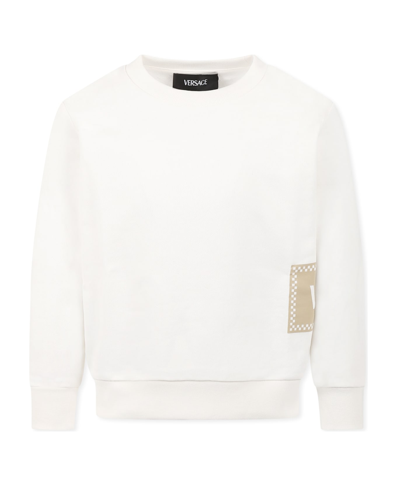 White sweatshirt from the luxury brand Versace, in brushed cotton, with long sleeves, crew neck, ribbed cuffs and hem. It is embellished with Versace logo on one side.
