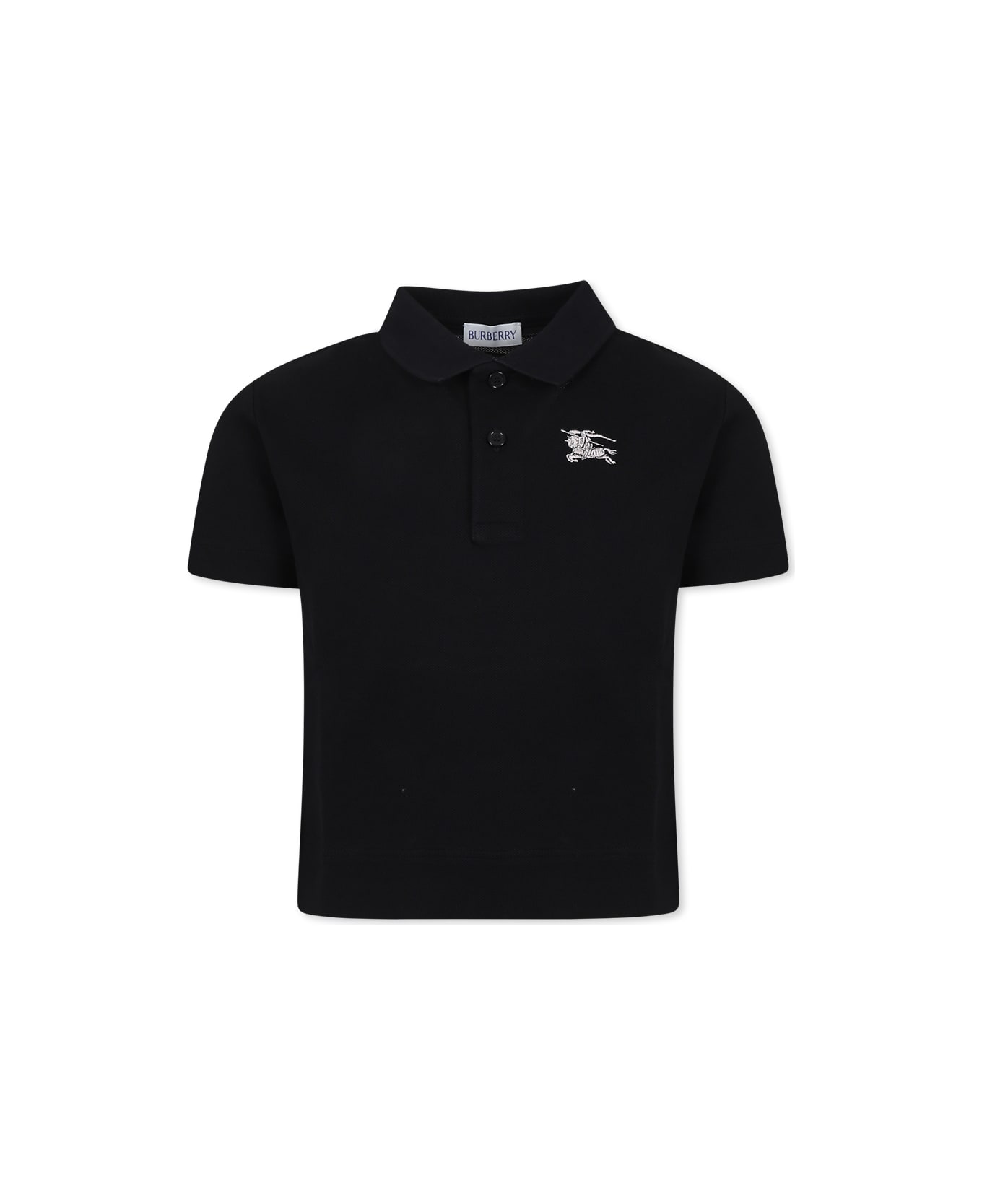 Black polo shirt from the luxury brand Burberry made of cotton, with short sleeves, collar and button closure on the front. It is embellished with an iconic ivory logo embroidered on the chest.