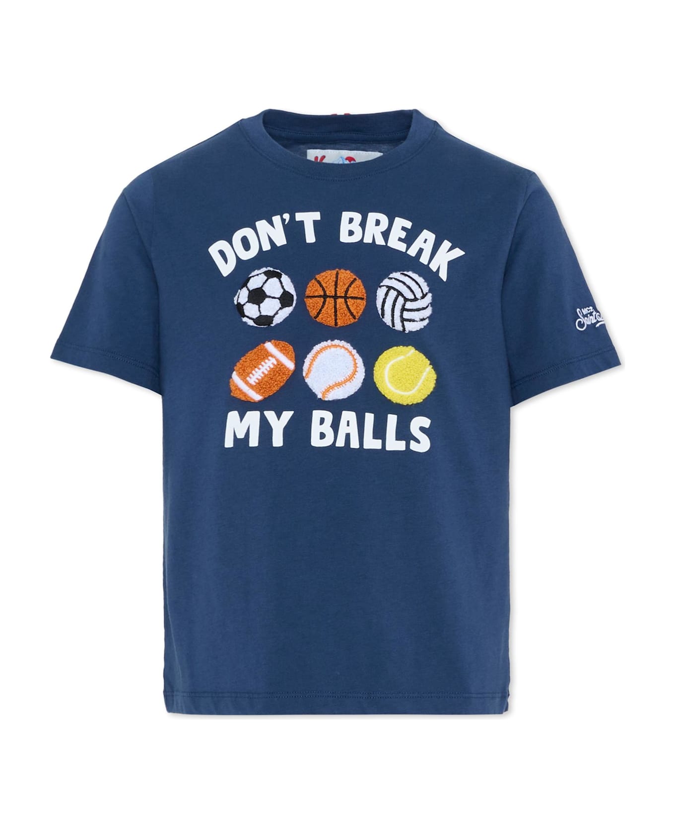 Blue organic cotton T-shirt with short sleeves and a ribbed crew neck; size 2 years features a snap button closure on the shoulder. It is embellished "Don't break my balls" lettering and terry cloth balls on the front and an embroidered logo on one sleeve.