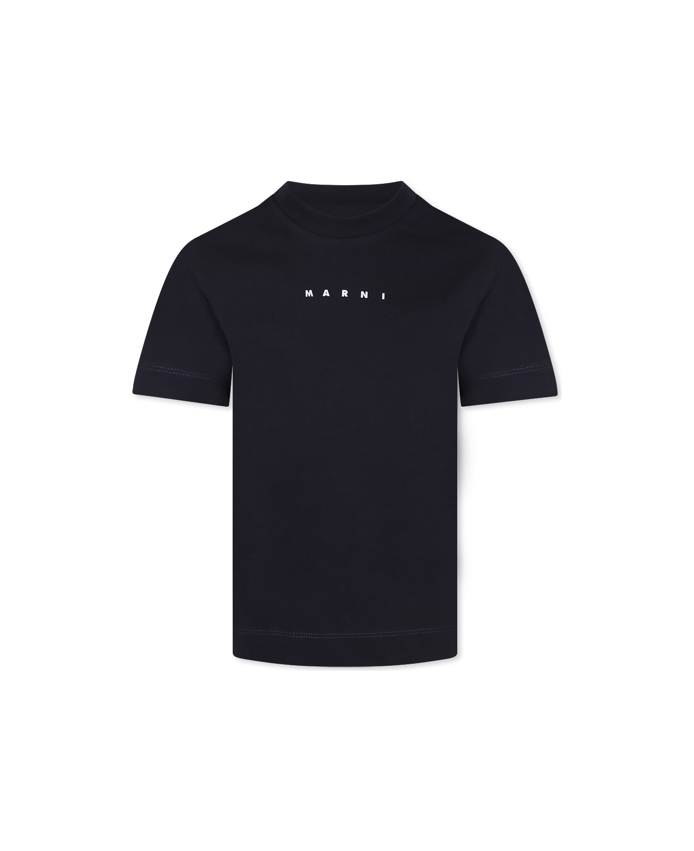Blue cotton t-shirt, with short sleeves and ribbed crew neck. It is embellished with white Marni logo printed on the front.