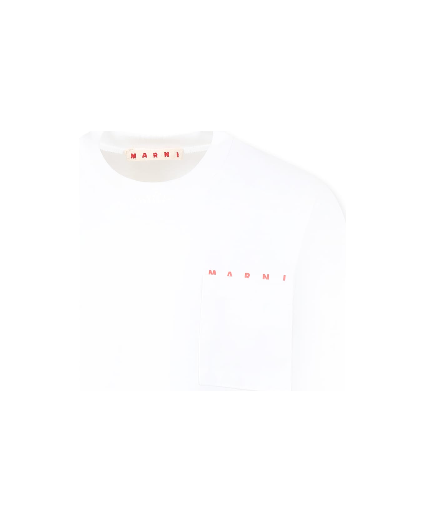 White cotton t-shirt, with short sleeves, ribbed crew neck and patch pocket on the chest. It is embellished with red logo on the chest.