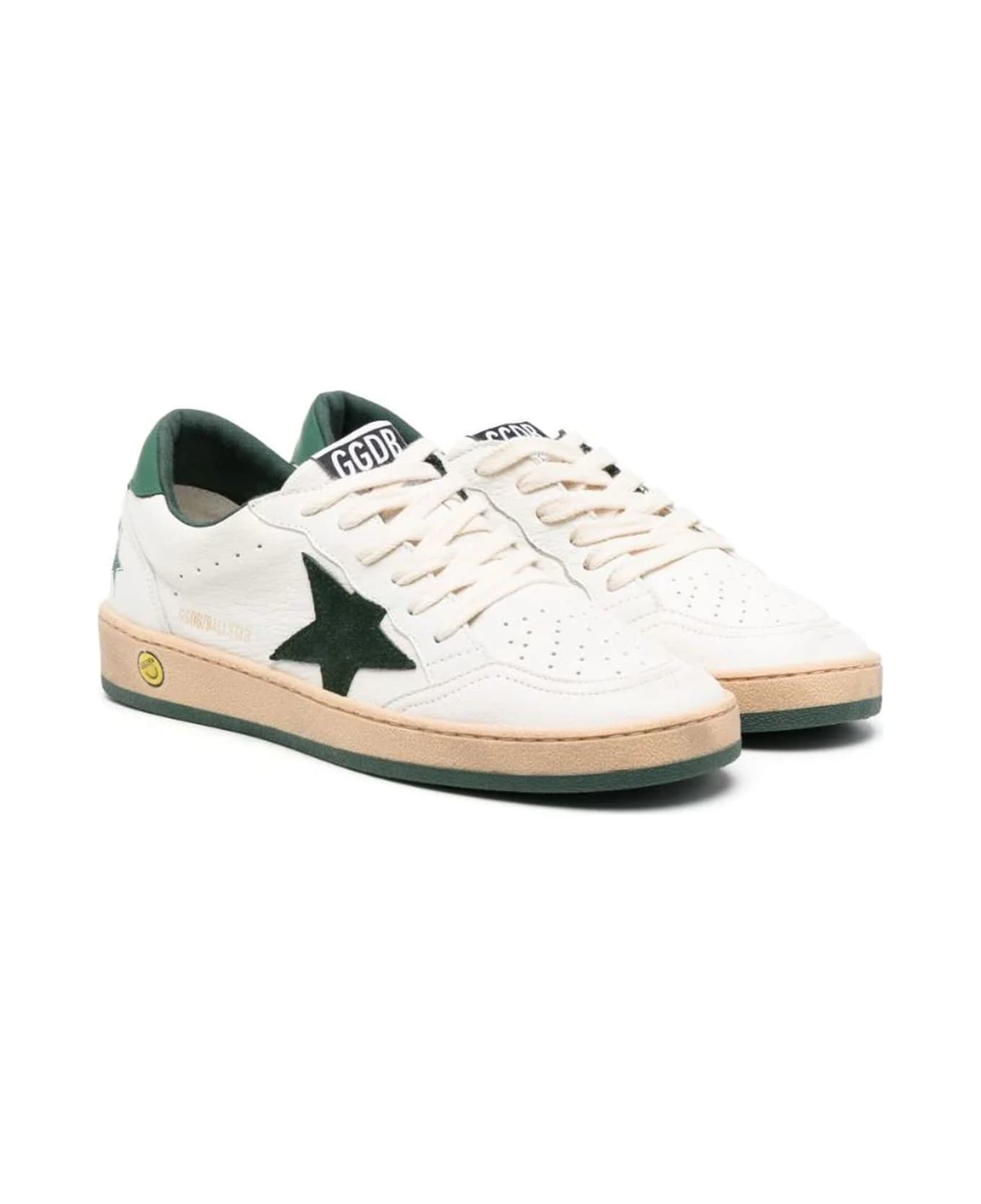 Off-white and forest green calf leather sneakers, perforated detailing, signature star patch to the sides, logo patch at the tongue, round toe, front lace-up fastening, branded insole, flat rubber sole