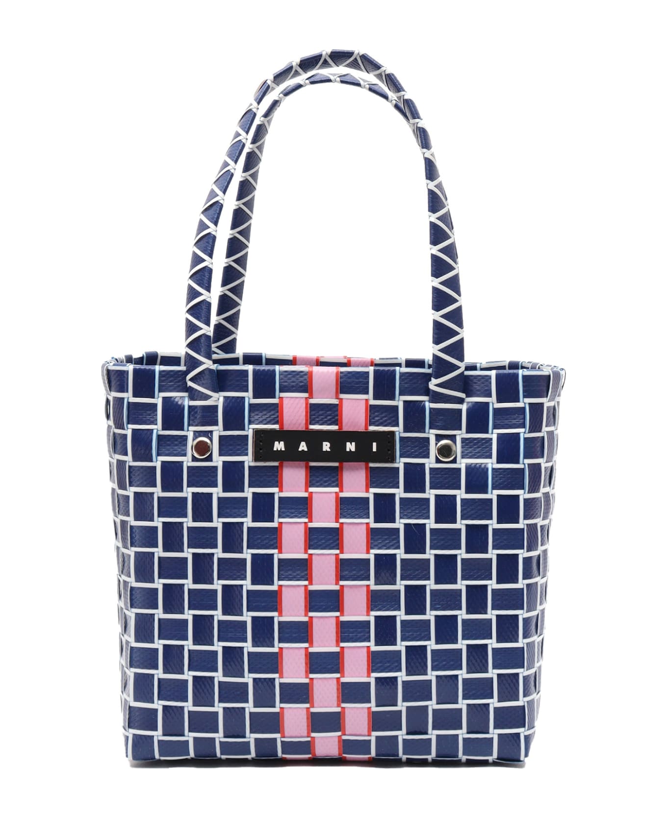 Plastic woven bag, double top handle, front leather logo detail, contrasting details