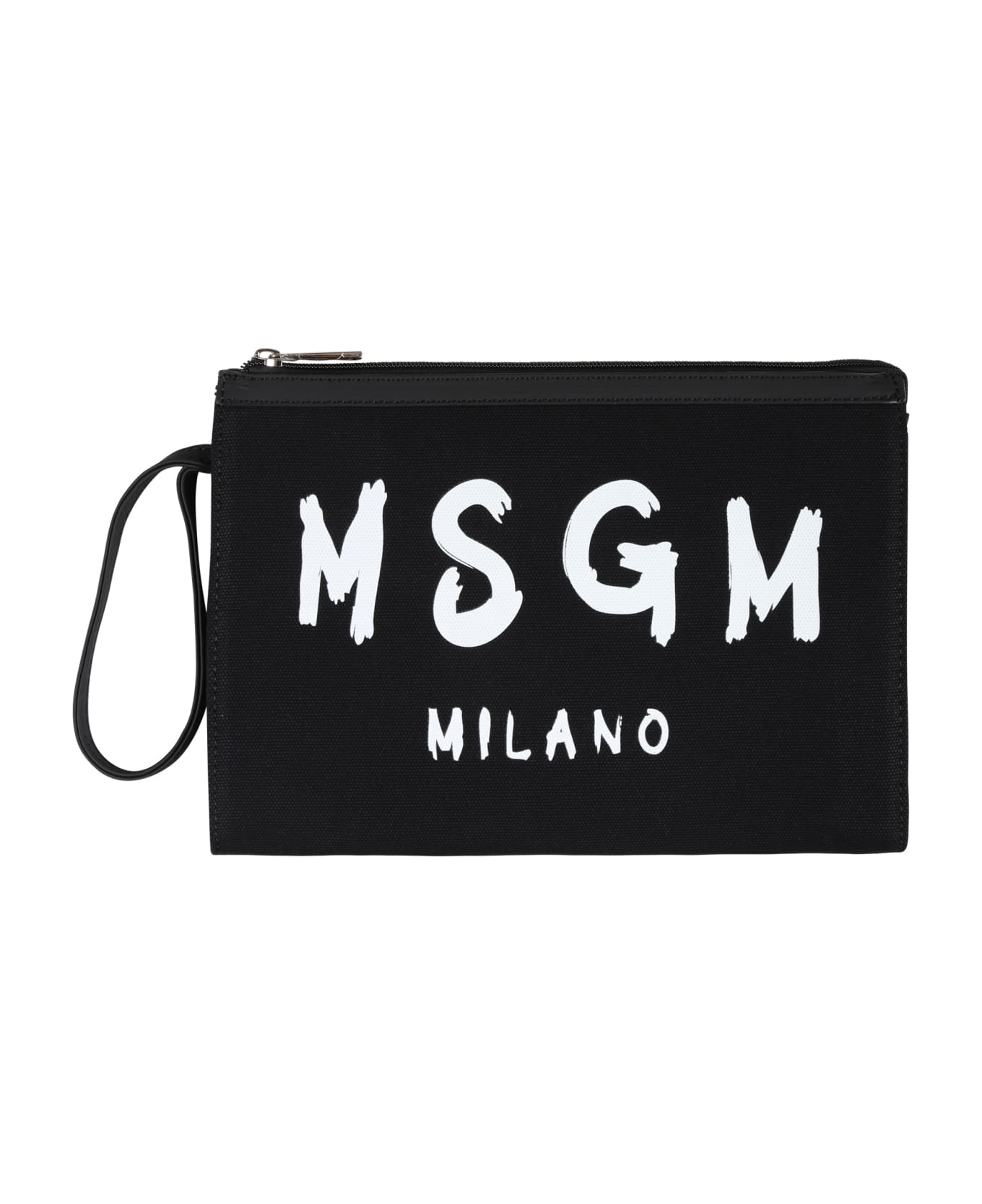 Color: Black Clutch bag black, wrist handle, zip closure, on top,. It is embellished with white logo, on the front. 85% Cotton. 15% Polyurethane. 29x21x3cm.