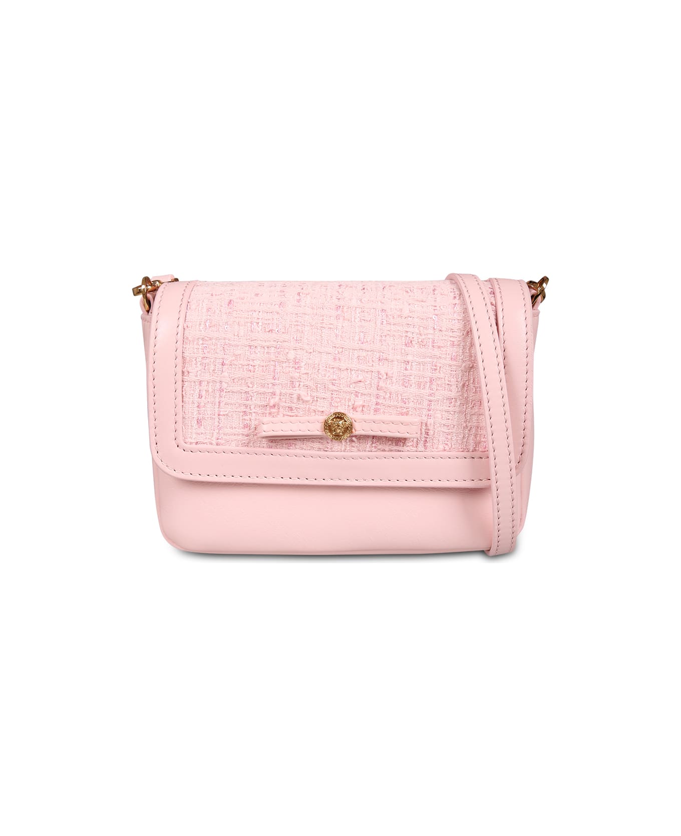 Pink bag from the Italian luxury brand Versace Kids, made of leather. It features a practical adjustable shoulder strap, front closure with magnetic button and a tweed flap. It is embellished with metal Medusa on the front, gold Versace logo on the back and sequins on the top