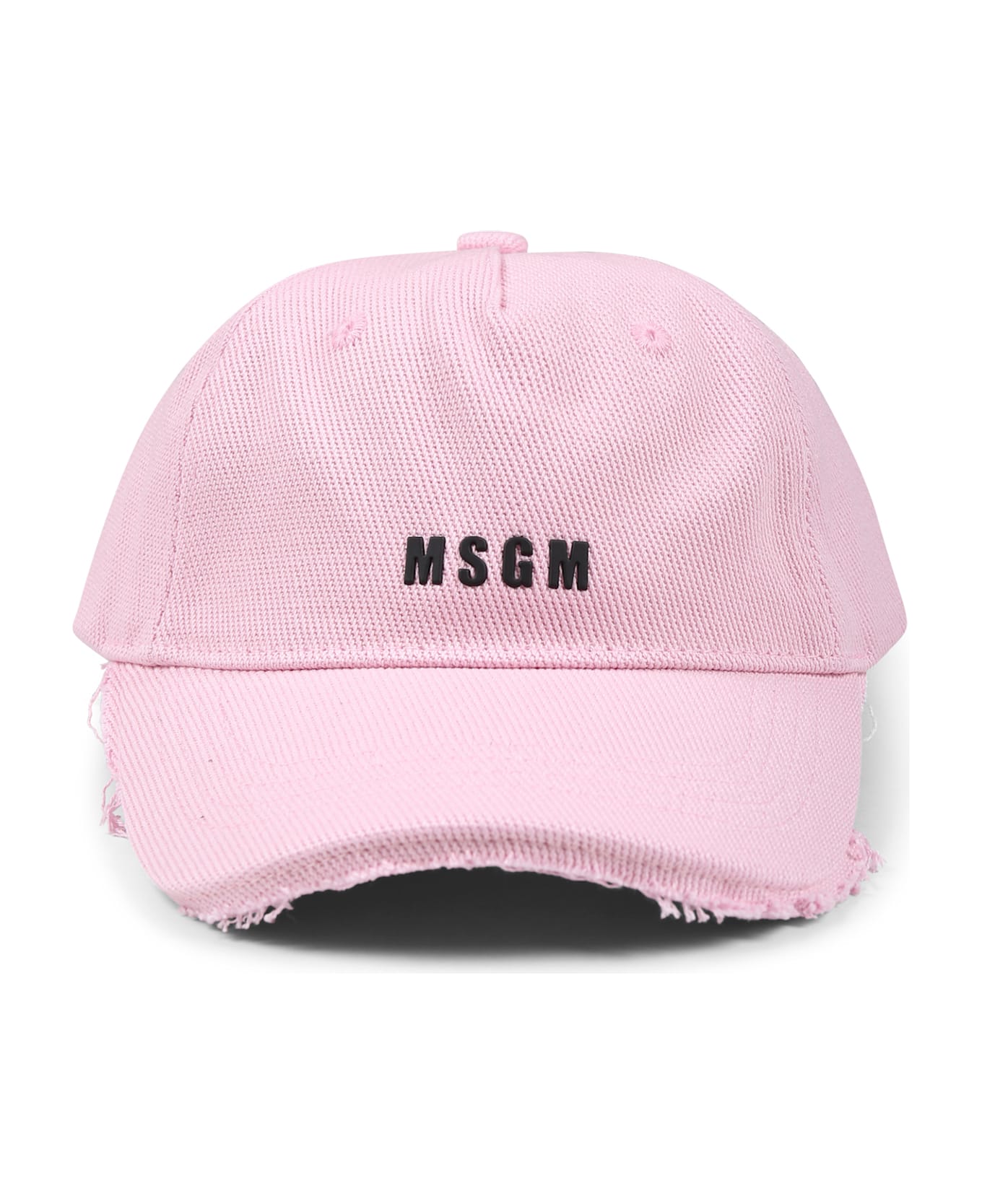 Pink cotton hat, with visor with frayed edges and adjustable closure on the back. It is embellished with black MSGM logo on the front.