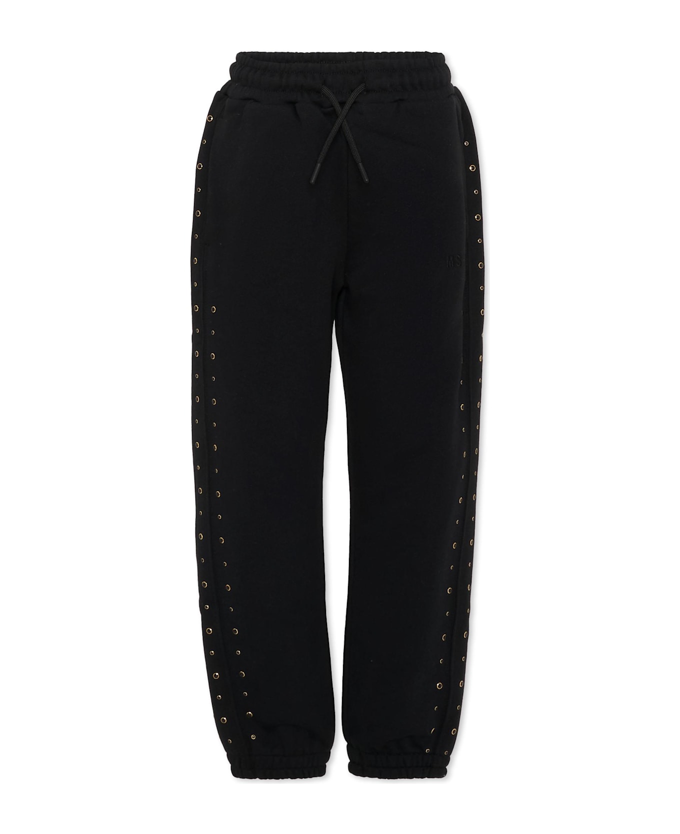 Black fleece cotton trousers, with an elasticated waist, drawstring, side pockets, and elasticated cuffs. They are embellished with studs on the sides and an embroidered logo on one leg.