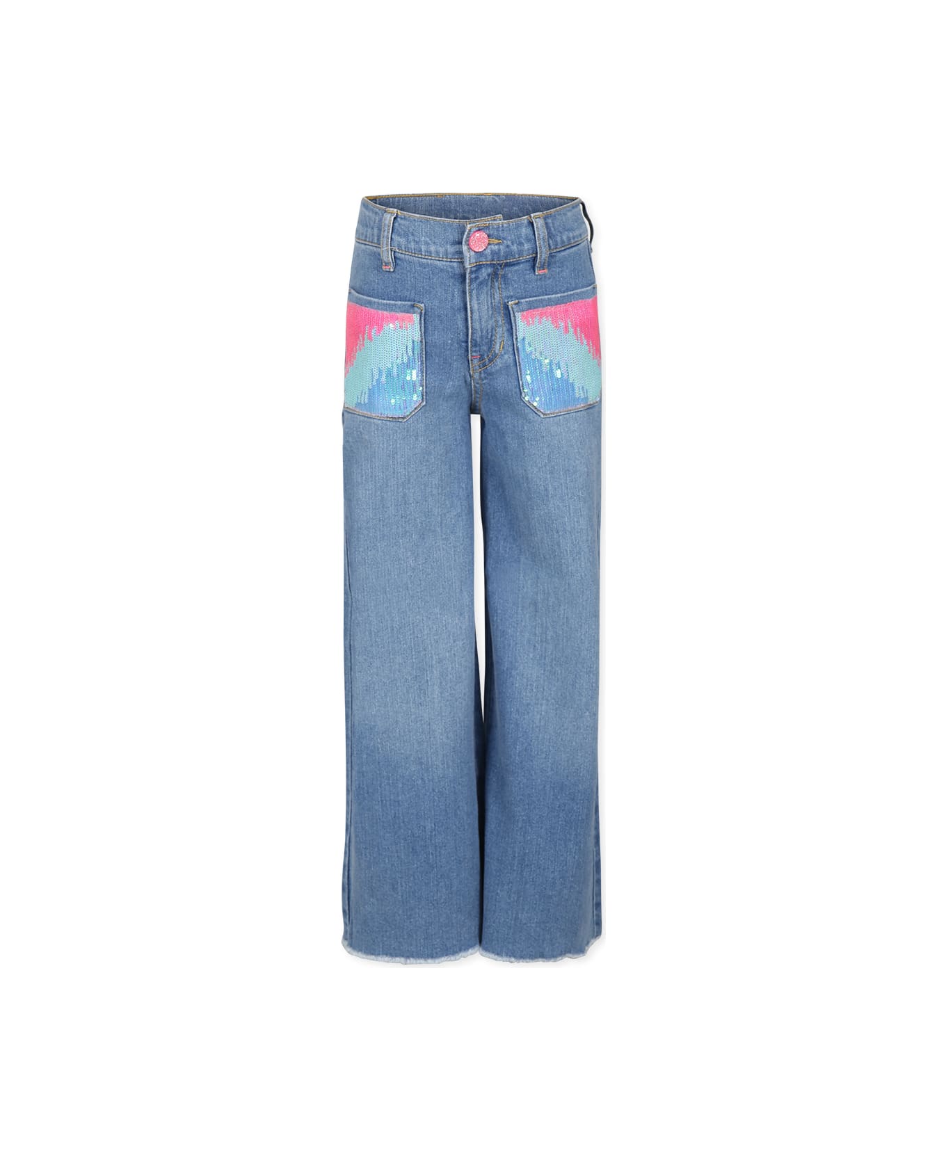 Blue denim jeans, with belt loops, front zip and button closure, adjustable waist thanks to internal elastic with buttons, two sequined pockets on the front and fringed hems. They are embellished with a rubber logo patch on the back.