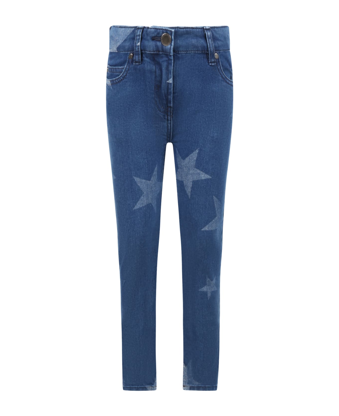 Five-pocket blue jeans in sustainable cotton, with adjustable waist thanks to the internal elastic bands with button and button and zip closure on the front. They are embellished with all-over stars and logo patch on the back.