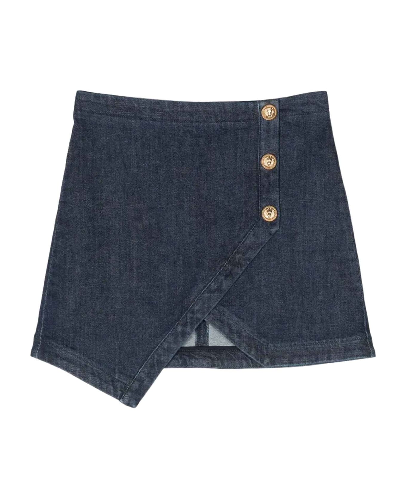 Blue skirt girl. Dark wash, decorative button detail, high waist, back zip closure and asymmetrical hem. Cotton 98%, Elastane 2%