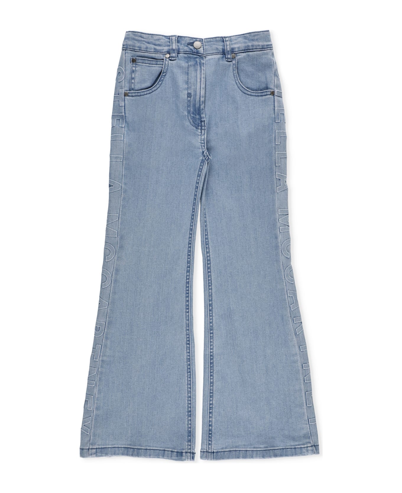 - Blue Stella Mc Cartney cotton flared trousers for girl - Five pockets - Belt loops - Front zip and hook fastening - Side tone on tone embossed logo