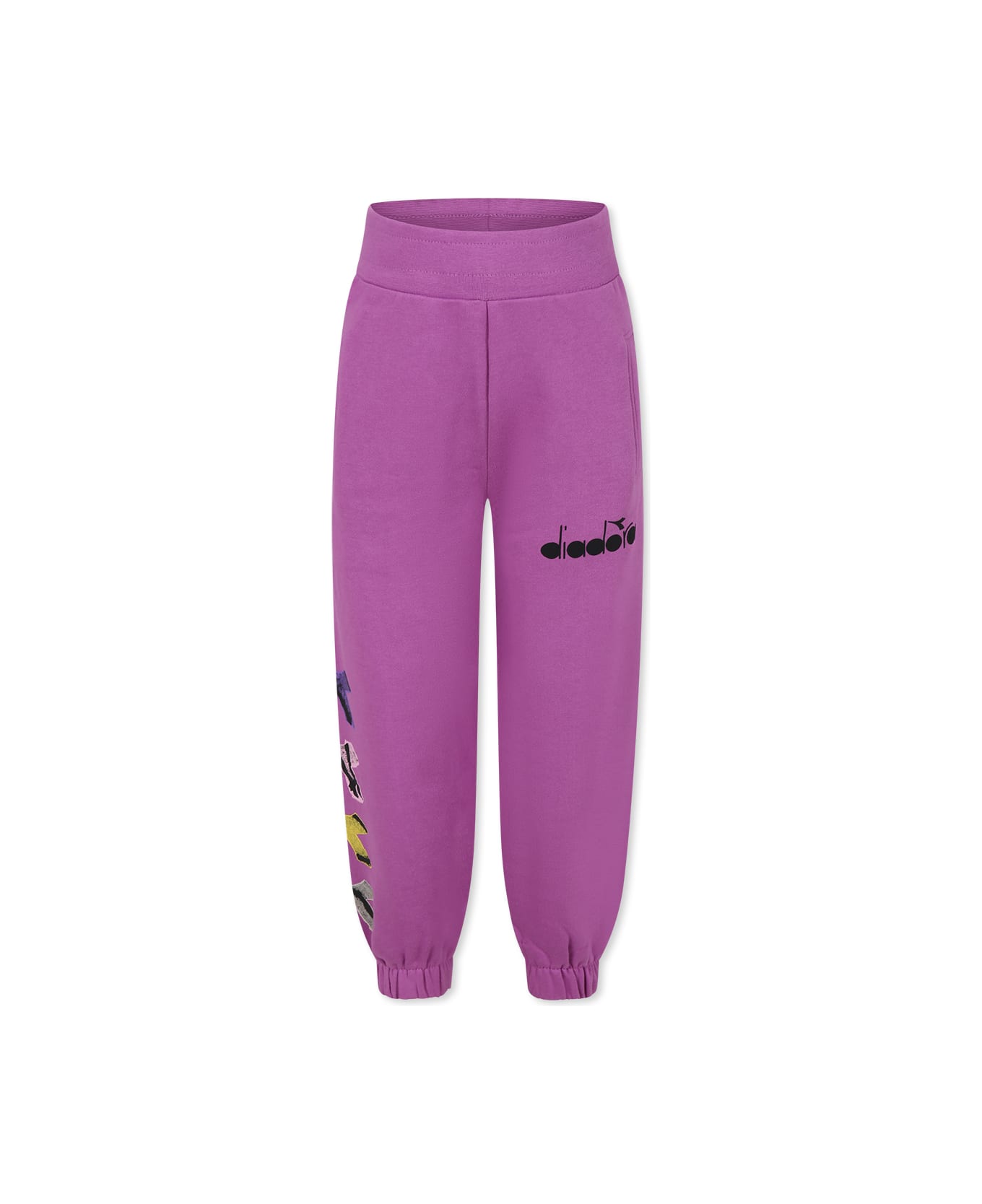 Purple trousers in cotton, with elasticated waist, side pockets and elasticated ankles. They are embellished with balck logo on the front and multicolor logos on one side.