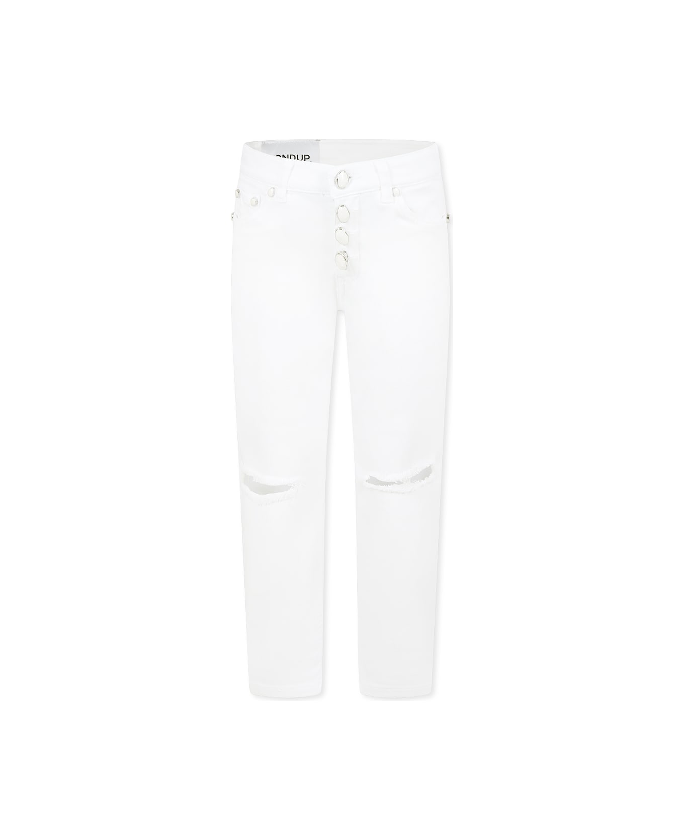 White five-pocket trousers, with belt loops, front zip and button fastening, adjustable waist thanks to internal elastic with buttons, fake tears with a worn effect. They are embellished with a metal logo on the back and stone buttons on the front.