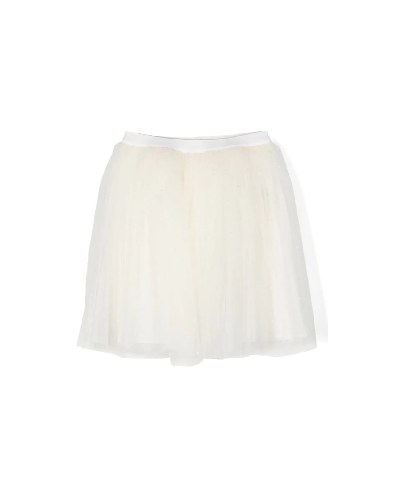 Tutu-style mini skirt by Bonpoint made of white tulle with all-over embroidered micro polka dots. Flared model with layered design and elasticated waist.