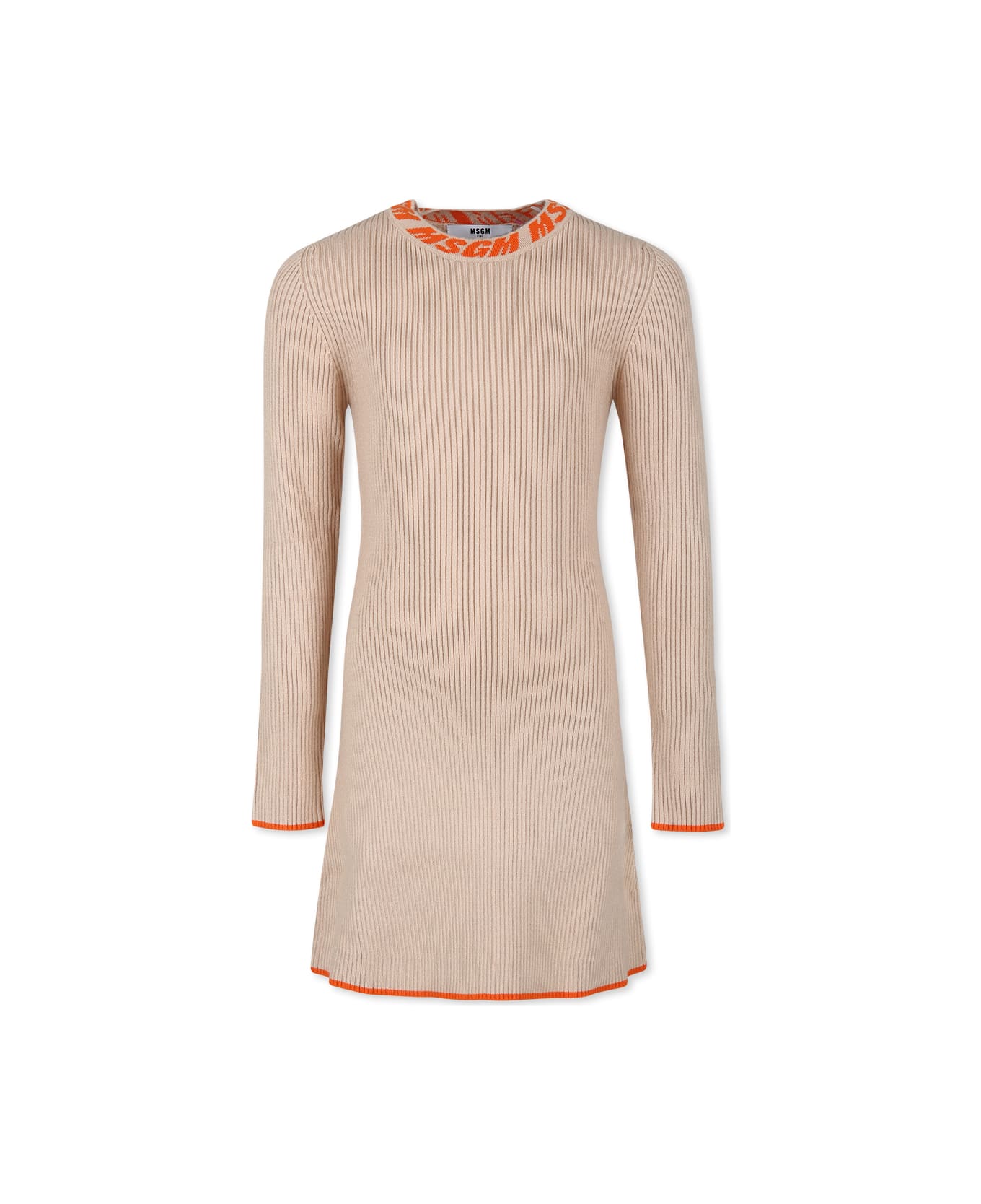 Beige dress in ribbed knit, with long sleeves and crew neck. It is embellished with orange jacquard logo around the neck.