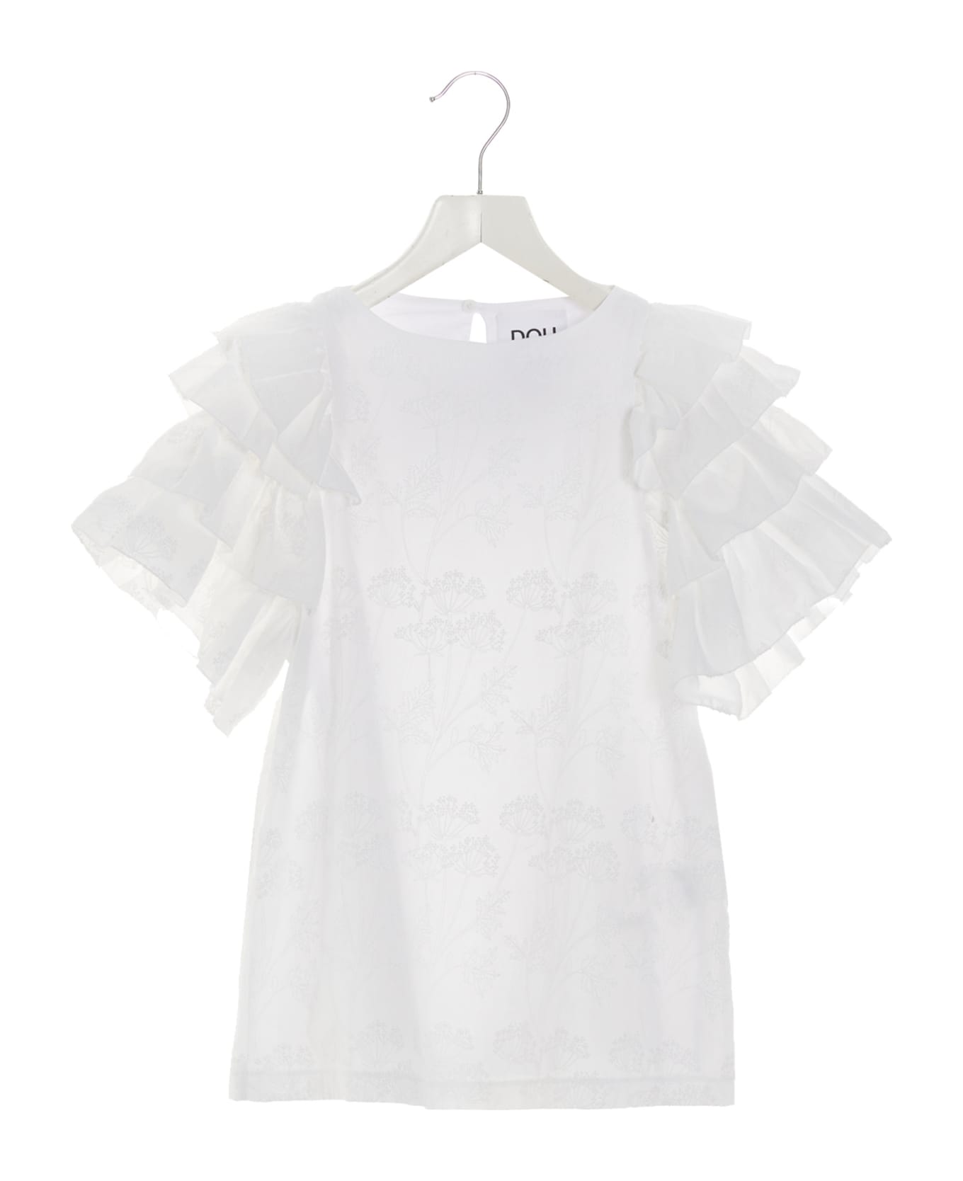 all-over embroidered cotton dress, with crewneck, flounced short sleeves.