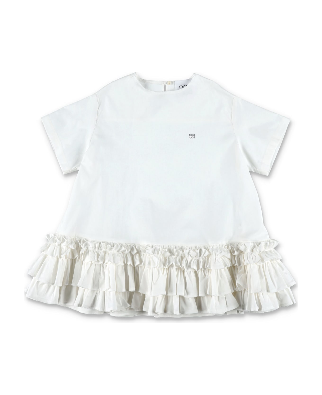 Cotton Woven Dress By Douuod. Featuring: Round Neck Short Sleeves Logo Print At Chest Back Button Closure Flounced Hem