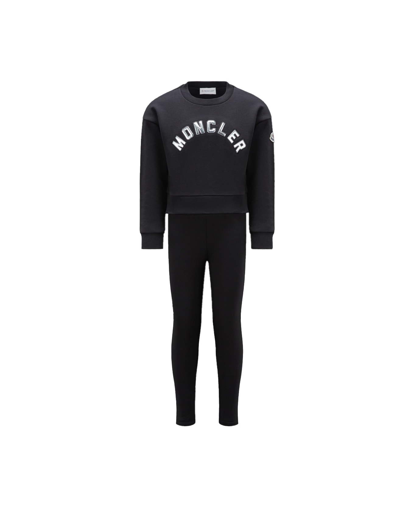 Moncler Enfant tracksuit made of soft black fleece and composed of a pant with an elasticized waistband and a crewneck sweatshirt embellished with a padded logo on the front.