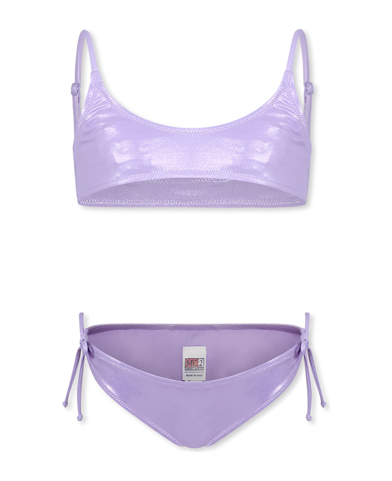 Purple bikini, with top with adjustable straps and briefs with side ties. It is embellished with a logo patch on the back.