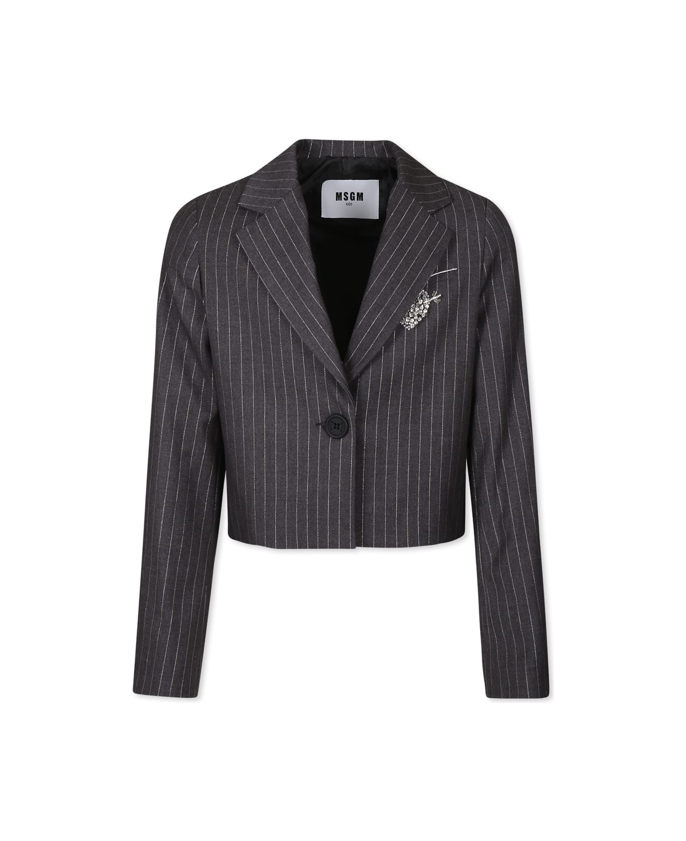 Gray cropped jacket with long sleeves and button closure on the front. It is embellished with white embroidered logo and heart-shaped rhinestone and sequin application on the chest.